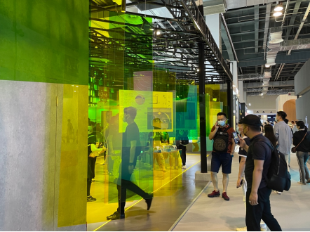 语言,体现“YOUNG世代”强烈个性追求和自我价值主张的表达,颠覆性地打造了一个沉浸式的流动空间。通过对色彩与材料的全新碰撞,将醒目的色调与个性化的定制产品结合,为个性表达赋予了空间。