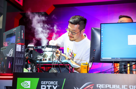 在新品发布会过后,TONY大叔和B站百大UP主@远古时代装机猿的液氮超频挑战也接续上演。液氮超频这个项目在去年的BW嘉年华上就吸引了大量观众的瞩目,今年的挑战更是有非常多的玩家观众慕名而来。在超频专区中设置了两款电竞显示器:ROG Swift PG279QM超凡电竞显示器和ROG Strix XG27AQ绝景电竞显示器。