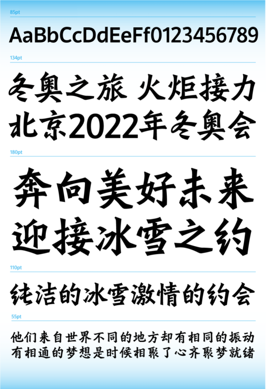 汉字是中华民族的文化代表,也是人类世界共同的精神财富。北京冬奥会专用字体旨在传承中华优秀传统文化,弘扬中华汉字书写精神,通过将汉字艺术与体育运动中的力量、气势等审美特质融为一体,以汉字书写诠释对冬奥精神内涵的理解,向全世界展示中国的体育精神、文化魅力,展现自然之美、人文之美与运动之美。
