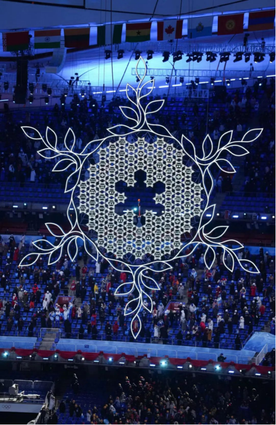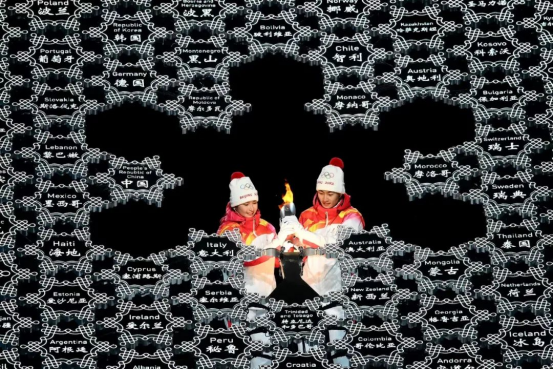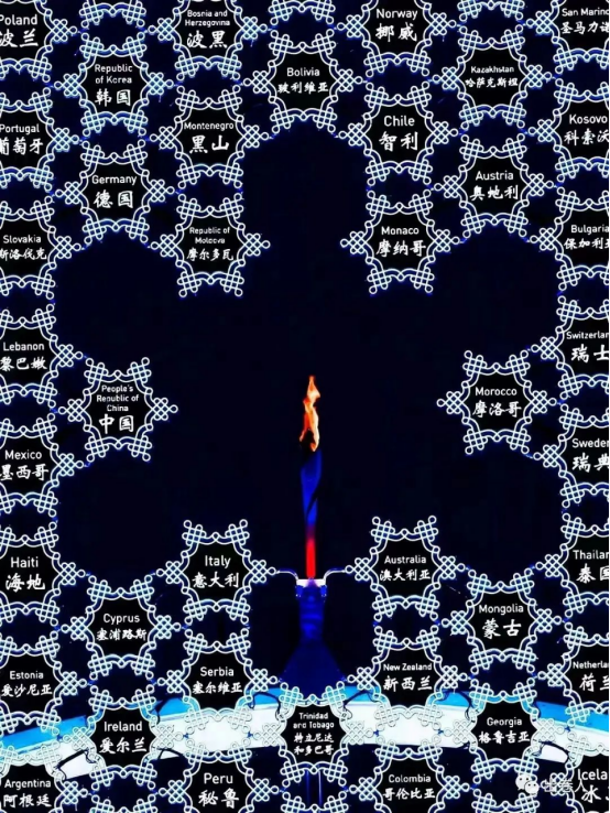 最后的点燃主火炬环节,所有参赛代表团的文字引导牌汇聚成主火炬的大雪花造型。让文字承载着所有奥运健儿的愿望,充分体现出更高、更快、更强、更团结的奥运理念。