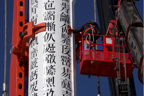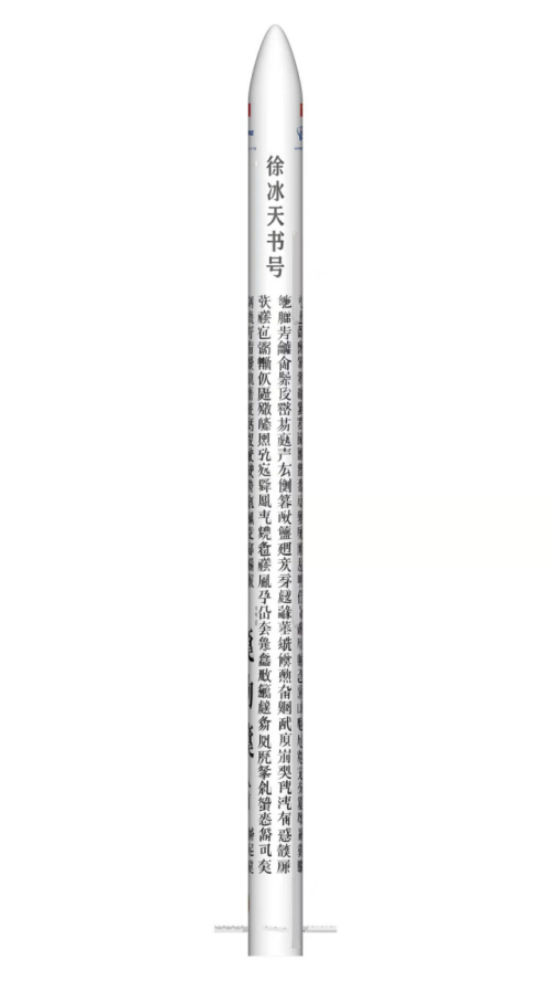 火箭箭体上布满的“天书文字”,来自于艺术家徐冰在35年前开始,历时四年创作的大型装置艺术《天书》。艺术家创造并刻制了四千多个形似汉字却不可识读的“天书文字”,并印制成册,铺天盖地于美术馆中,制造了一个“无解文字”的空间,引导人们对现有知识体系重新提问,并提示对文化的警觉。