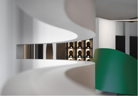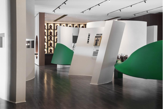 未见其形,先闻酒香,空气中弥漫着微醺的气息,绿色的丝带穿梭于空间,地面静默盈满的罗曼蒂克石材表现出深邃的内涵;随着绿色丝带的穿梭,白酒文化核心展区尽收眼底。