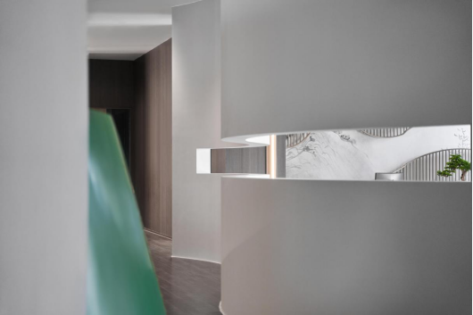 空间节奏不均匀的起伏注定了结构体系也是不规则的,格栅的光影呈现明暗交错的丰富关系,走廊上原木色调的地面与亮白的屏风,不同材质的碰撞,强调了兼收并蓄的风格。