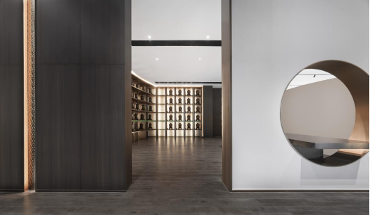 入目之处,一个个酒瓮均匀铺满展开的墙面,在灯光的晕染下,从白酒的诞生,到酱酒萃取的过程,浓缩于整个空间,框景的内容跟随行人,步移景异。