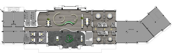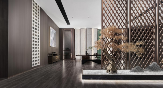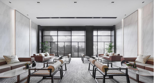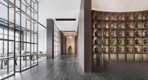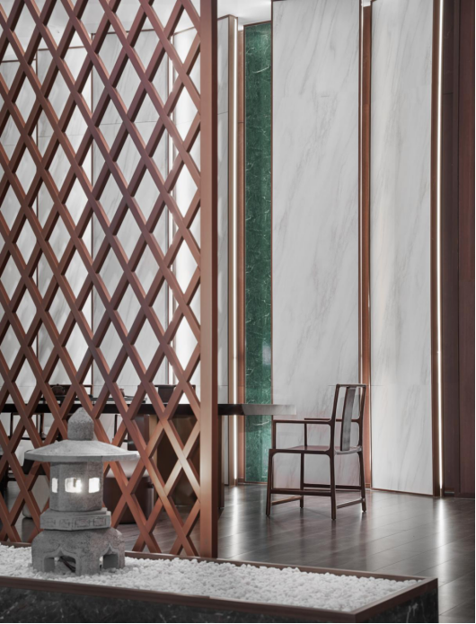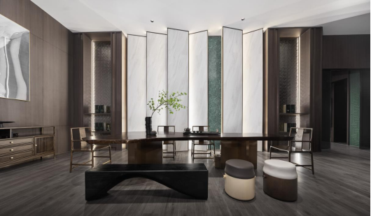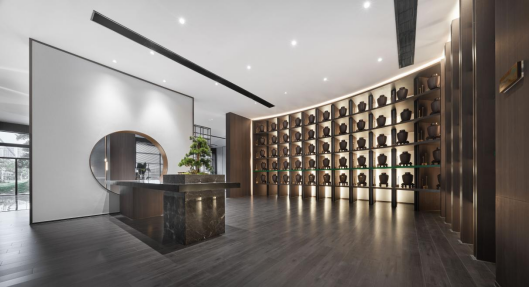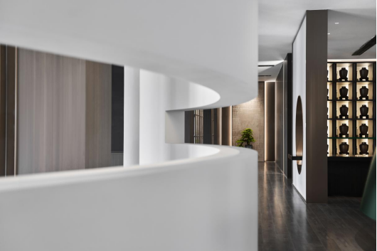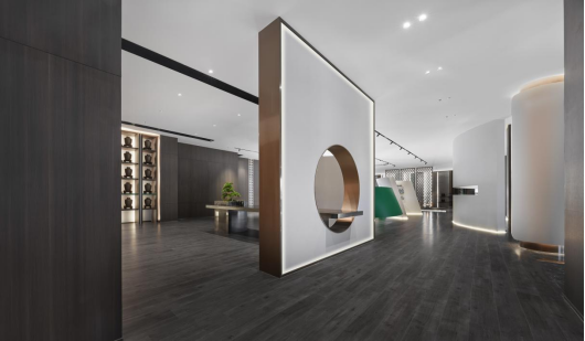 经过走廊,人与场地的链接逐渐加深,随着步伐的深入,不同的墙面、月洞门、屏风、镂空博古架巧妙地分隔出数个半开放空间,满足不同用户群体的会客需求。