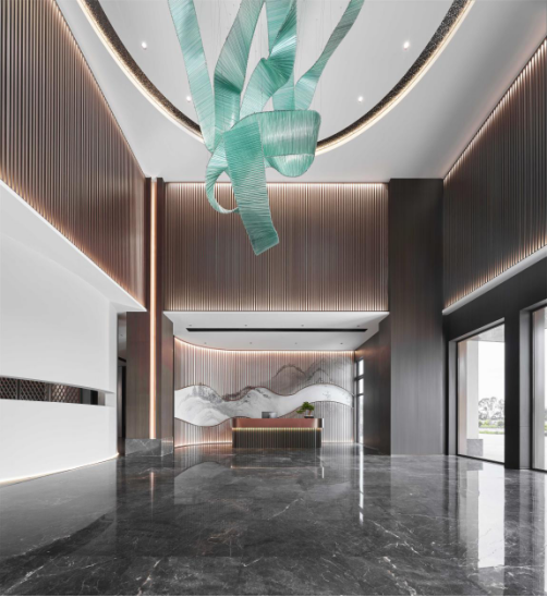 厅堂之上,巨幅的山水浮雕吸引着所有来访者的眼光。这不是表面符号化和简单元素的拼贴,而是融合东方“醉翁之意不在酒,在乎山水之间也”的诗意,以现代独特的视觉体验,将“酒”的意象进行具象化的呈现。