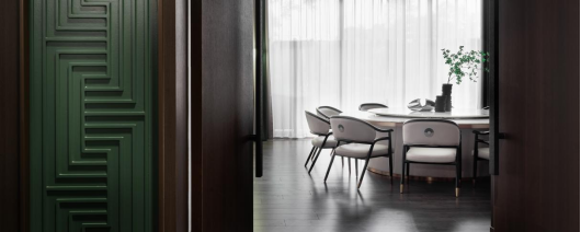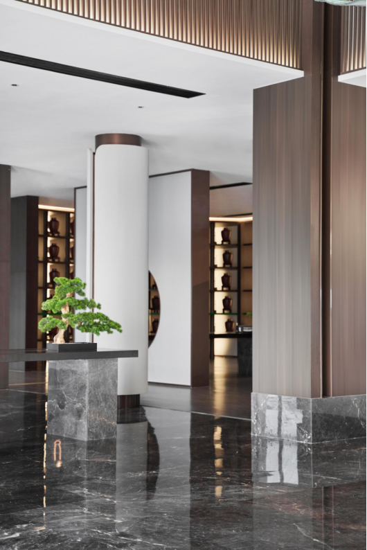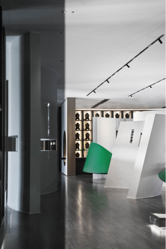 深棕色的主色调,引用徽派建筑的白墙,再由一抹翠绿带来灵动。简约并非简单和空白,而是利用比例、光线等手法,塑造了颇有质感的空间,背后是对文化本源的追溯与致敬。