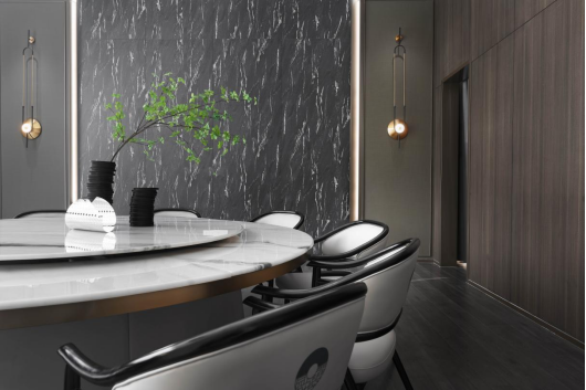 餐厅的布置,以圆桌的形态解构方形的局促,品酒岂可无美食?在觥筹交错间,品味天时、地气、才美、工巧的完美融合,分享这份自然与匠心的馈赠。而一支独秀的绿植,又为空间增添了勃勃的生机。