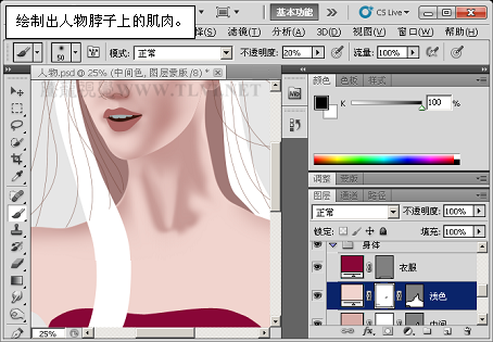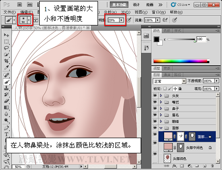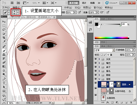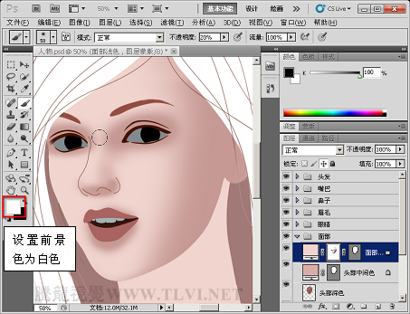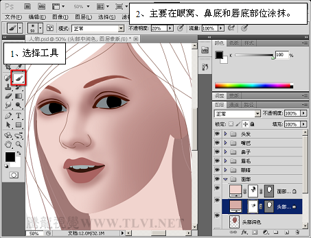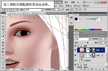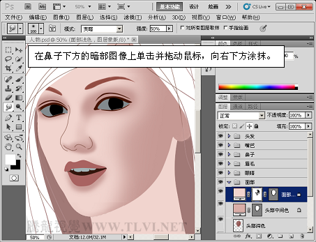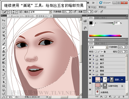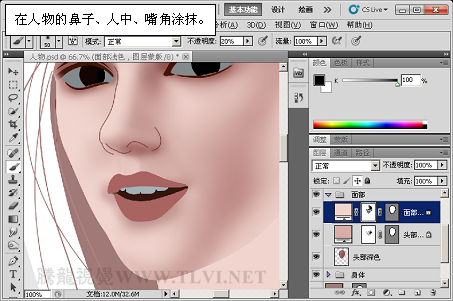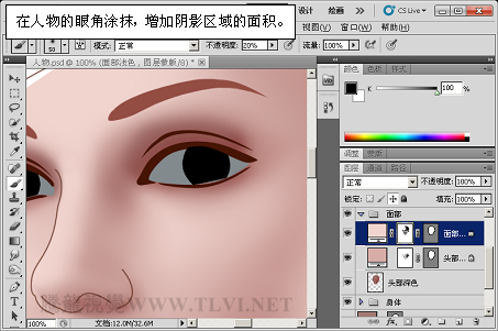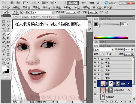 (12)继续使用“画笔”工具,增加面部阴影区域的细节。