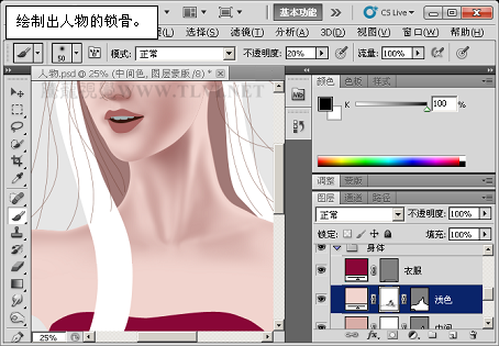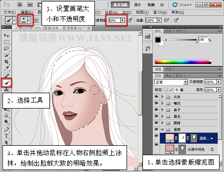 (11)选择“面部浅色”图层蒙版,并使用“画笔”工具绘制出人物的反光部分。13