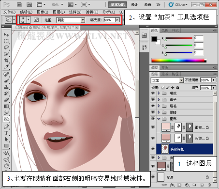 (10)这时的明暗程度并没有达到要求,选择“头部深色”图层,使用“加深”工具在图像上绘制。