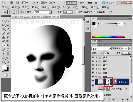 提示:在“面部浅色”图层蒙板上编辑,实际上是对该图层部分图像进行遮盖,从而显示出下层“头部中间色”图层上的图像颜色。