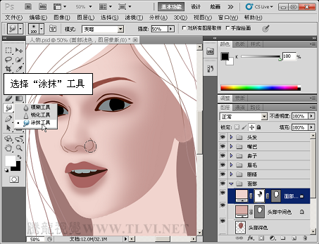 (7)使用“涂抹”工具,对鼻子下方的暗部图像向涂抹,增加鼻底的阴影效果,使其更具立体感。