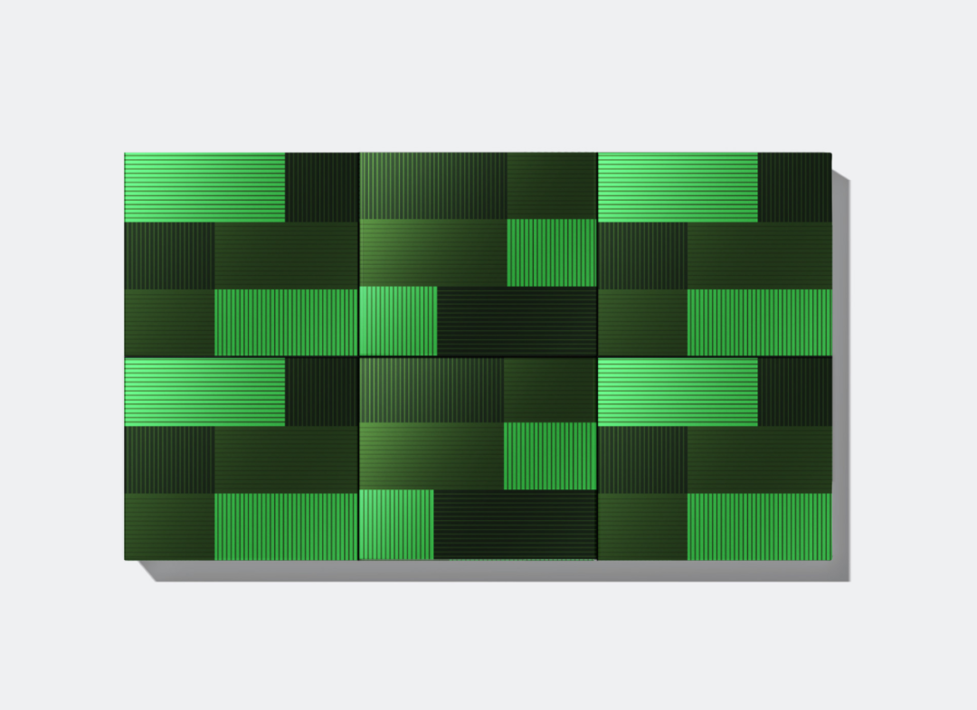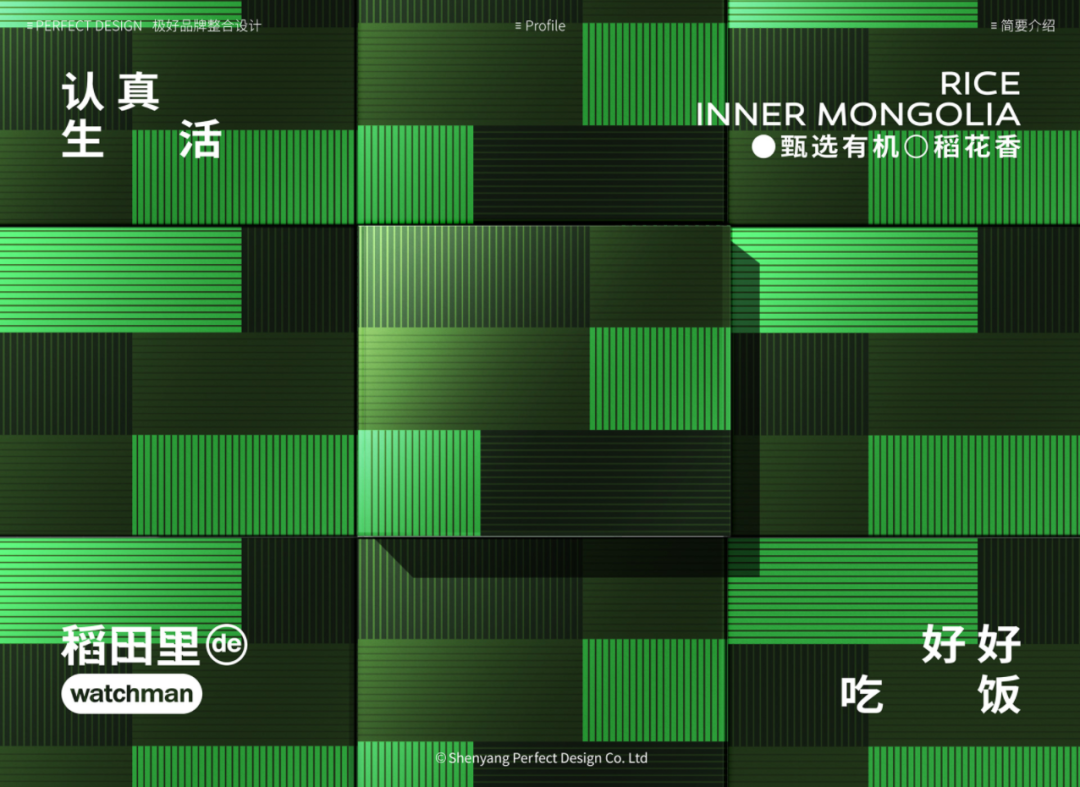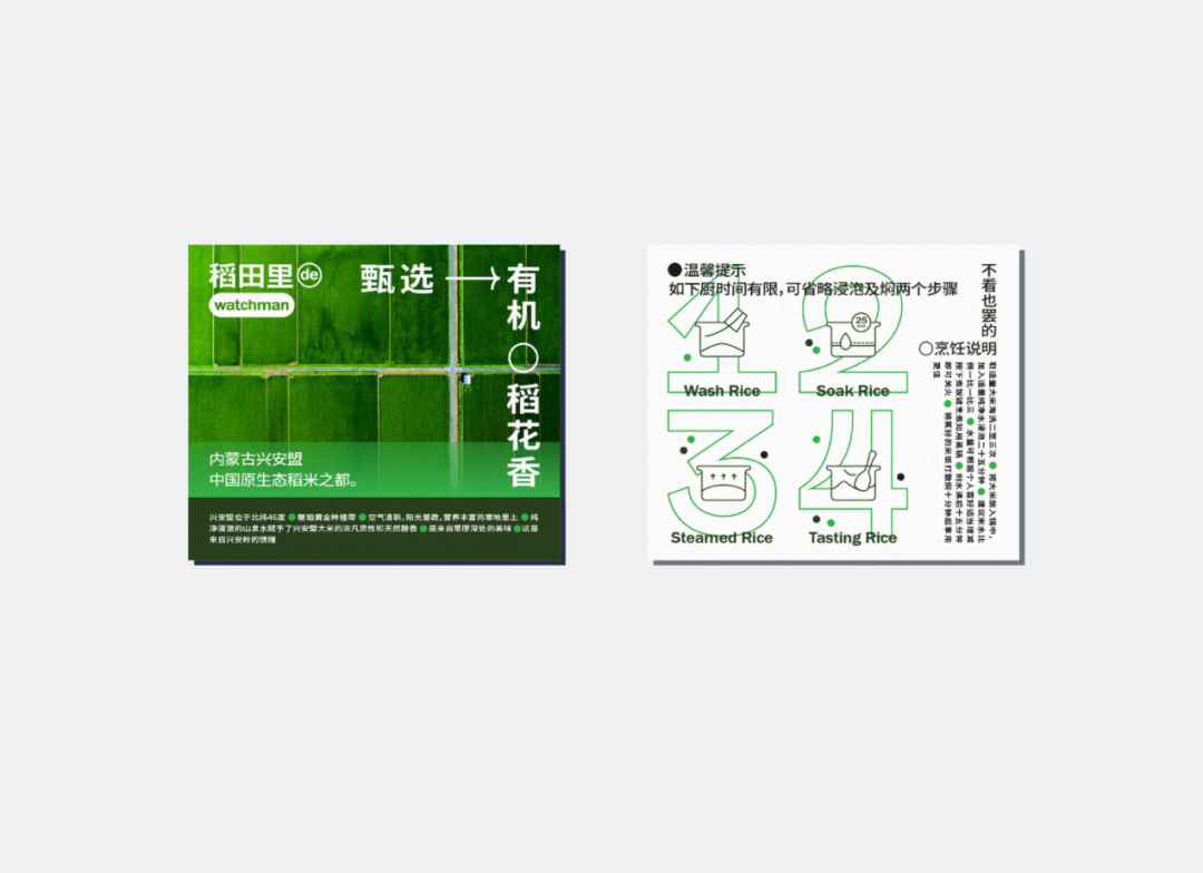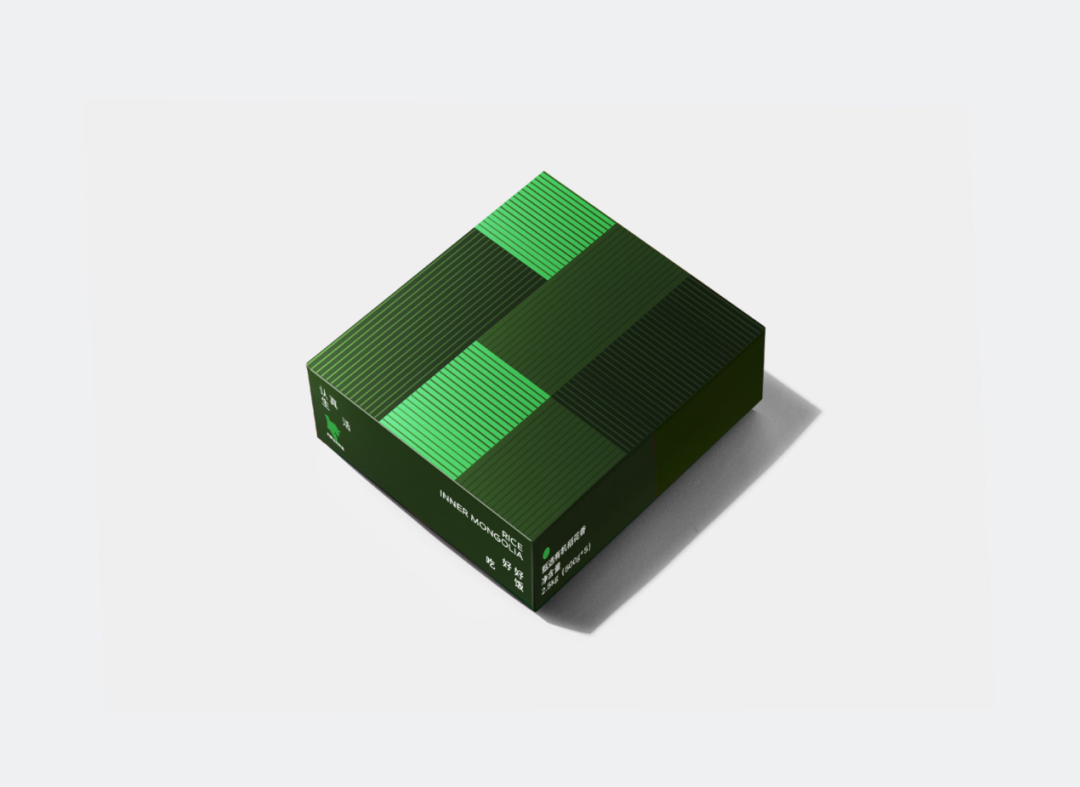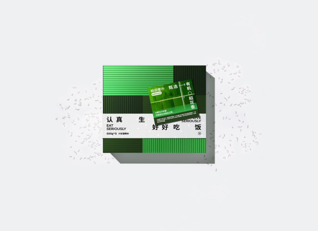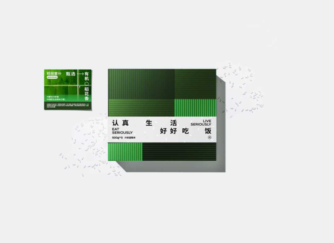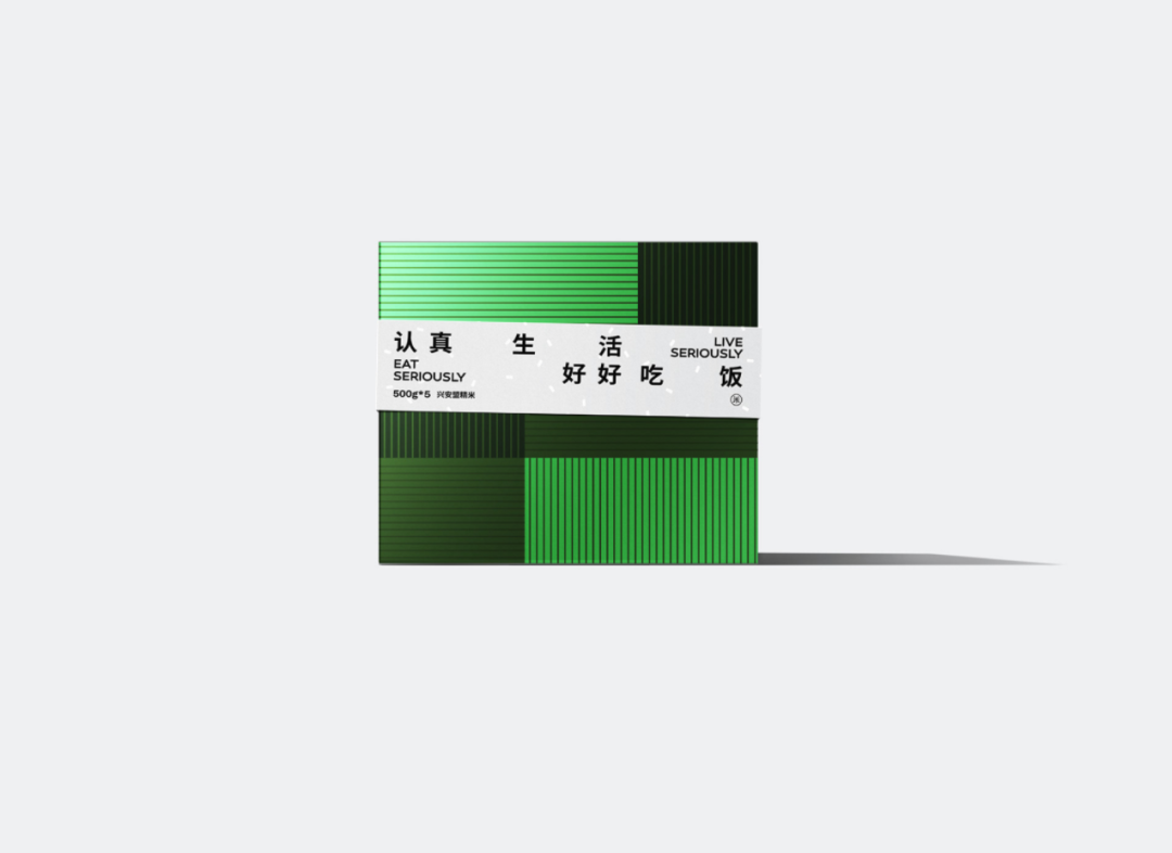 两款包装以重复排列的色块组合形成了延绵不断的“绿色稻田”,突出大米的地标特色,与市面上的竞品拉开差异,建立视觉优势,呈现一个有态度、有思考的农产品包装形象,简洁但极具辨识度。