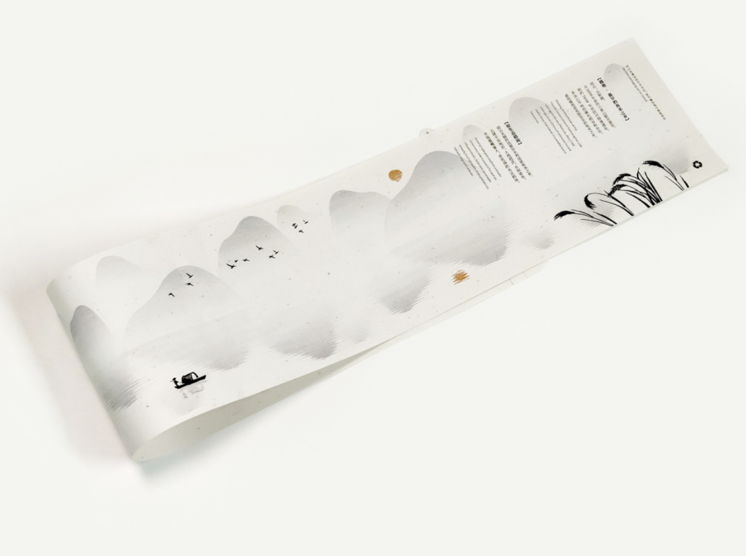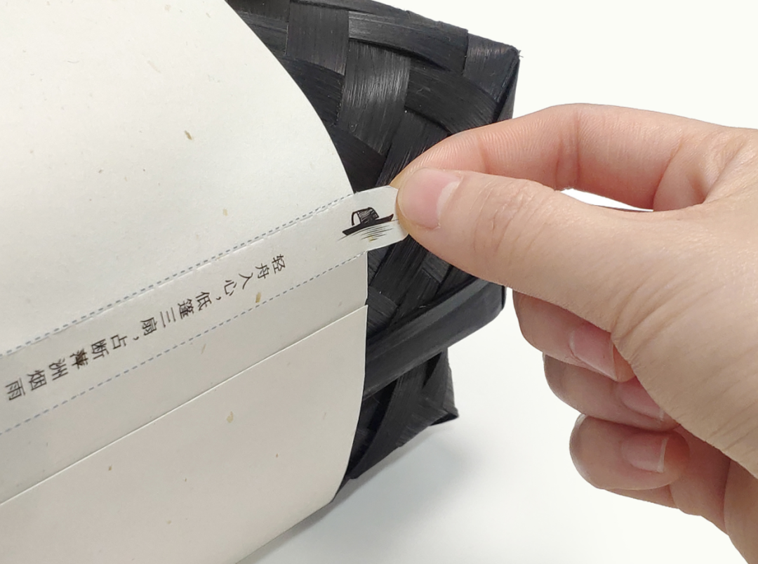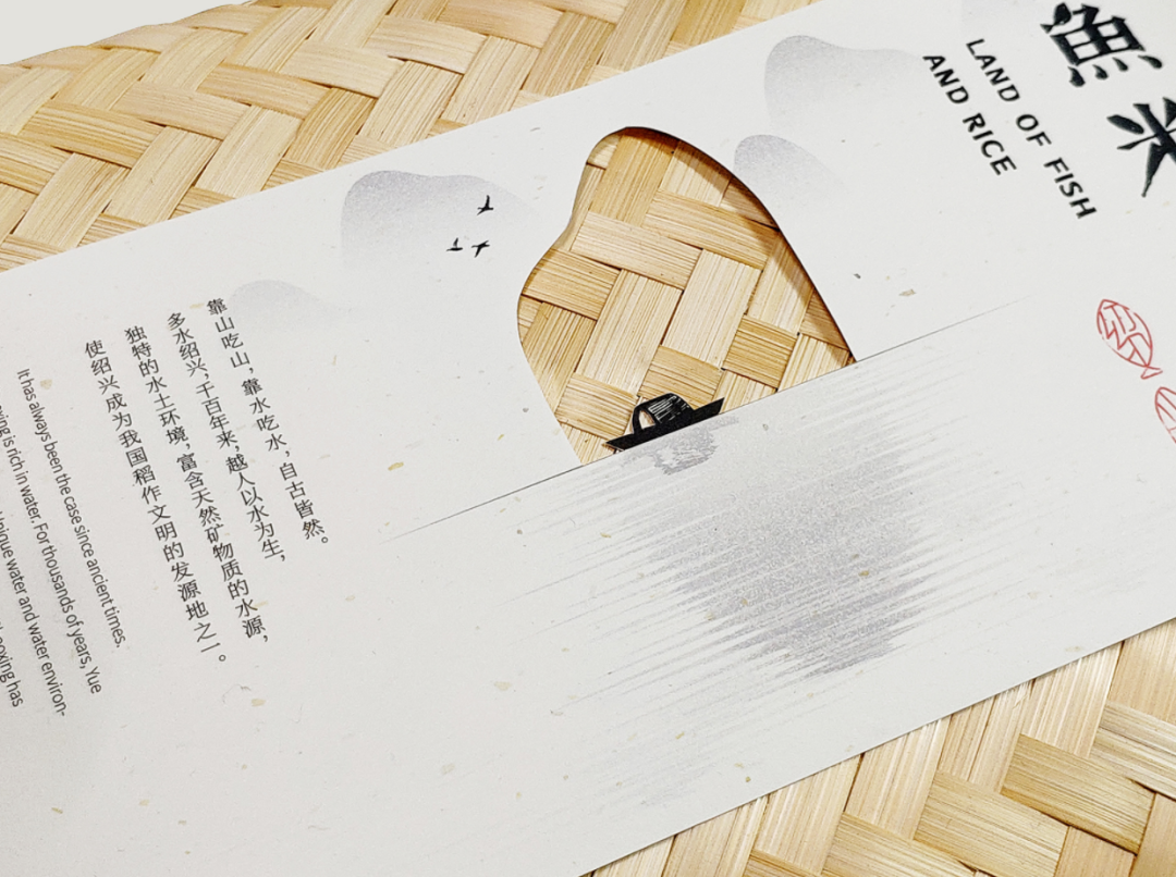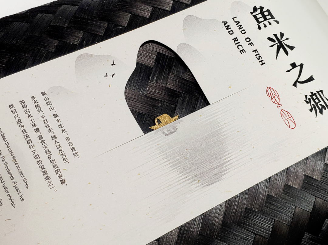 两个款式的竹编礼盒参考了绍兴竹艺文化的包装方式,而封套上的可撕拉处则融入了陆游的诗句--“轻舟入心,低蓬三扇,占断萍洲烟雨”以及乌篷船的图案点缀,进一步表现“鱼米之乡”的自然、纯粹与诗意。