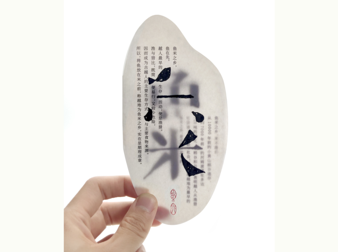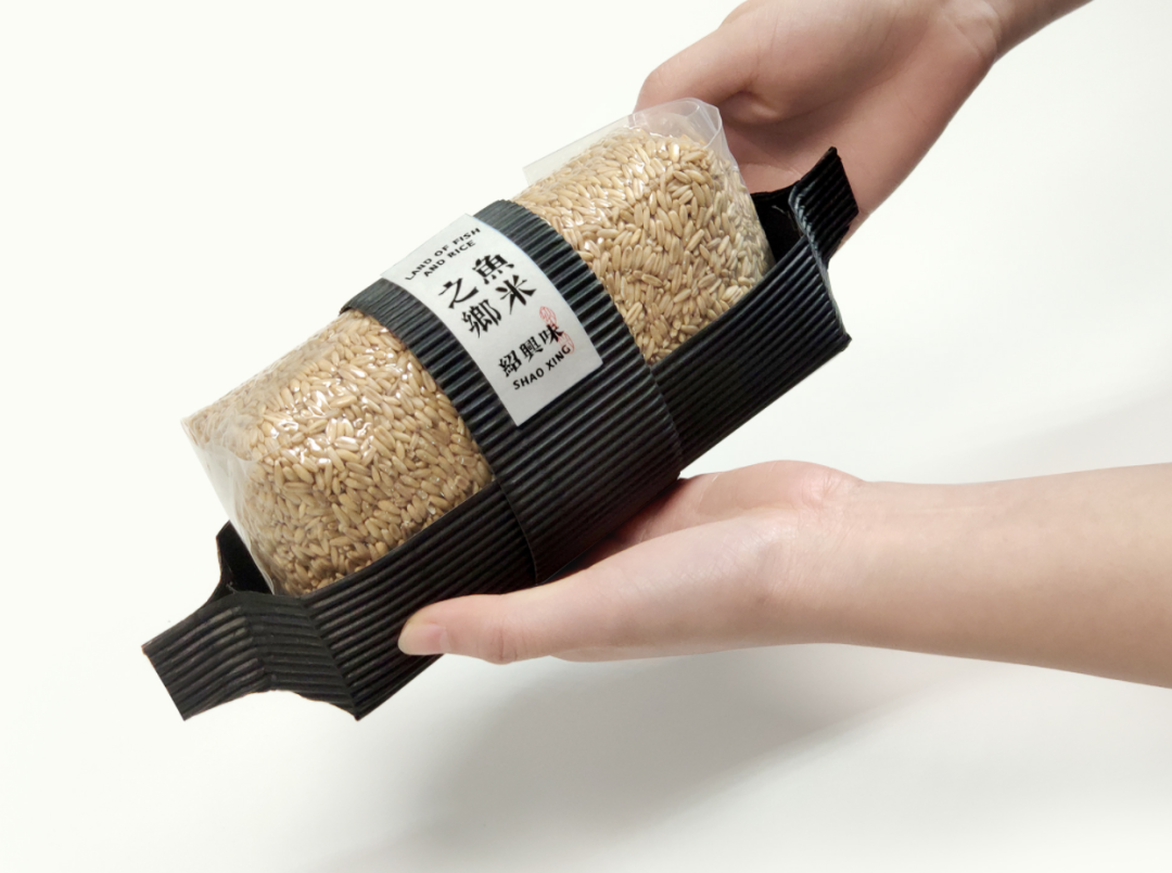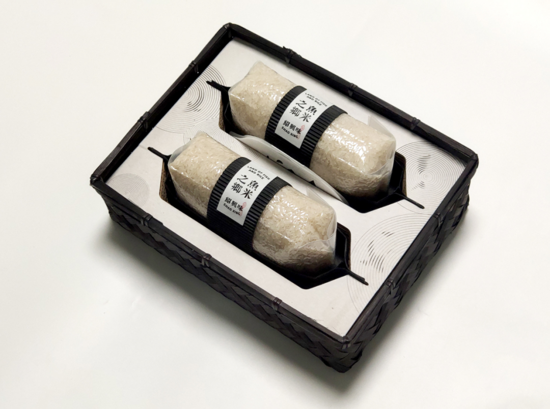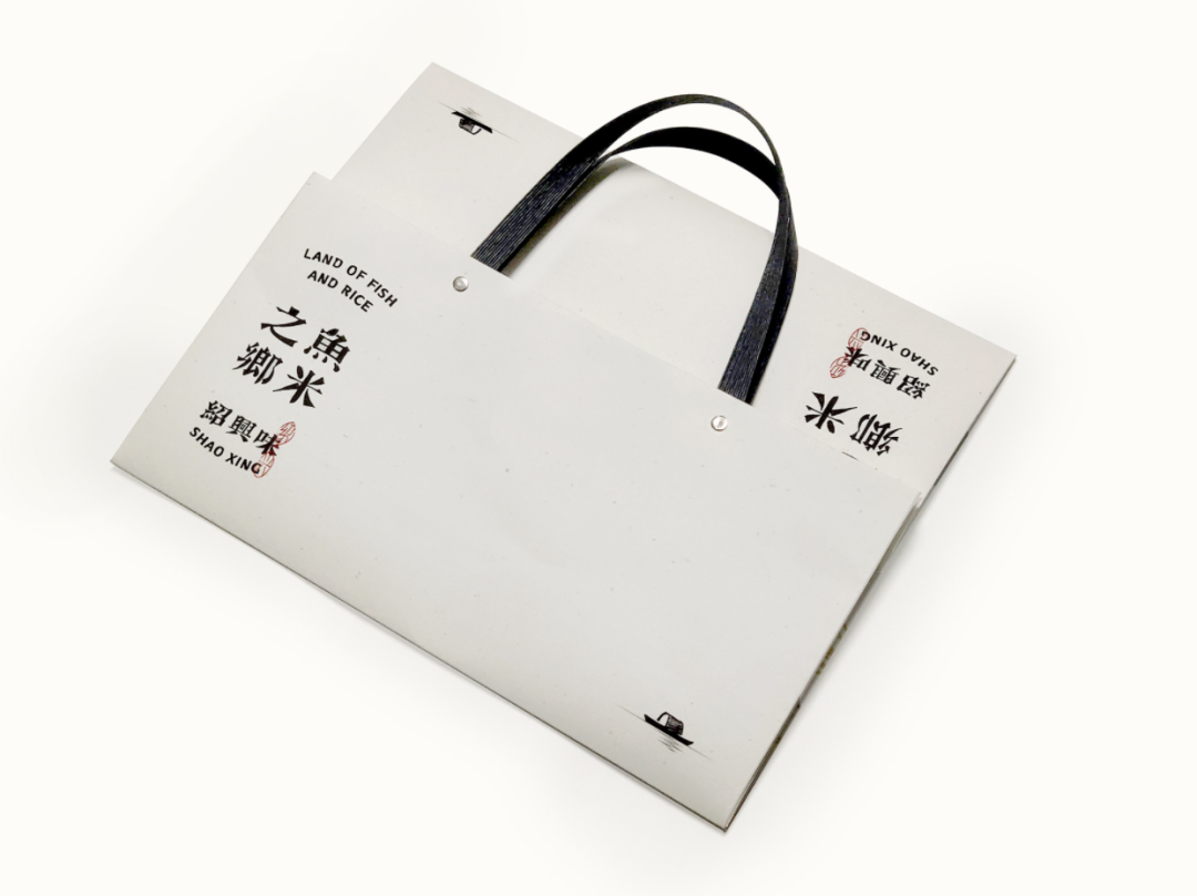 有大米颗粒形状的镂空图案搭配周围的朦胧山水、乌篷船以及飞鸟等营造了极具浪漫诗意的烟雨江南图景,形成了独有绍兴地域特色的产品包装。