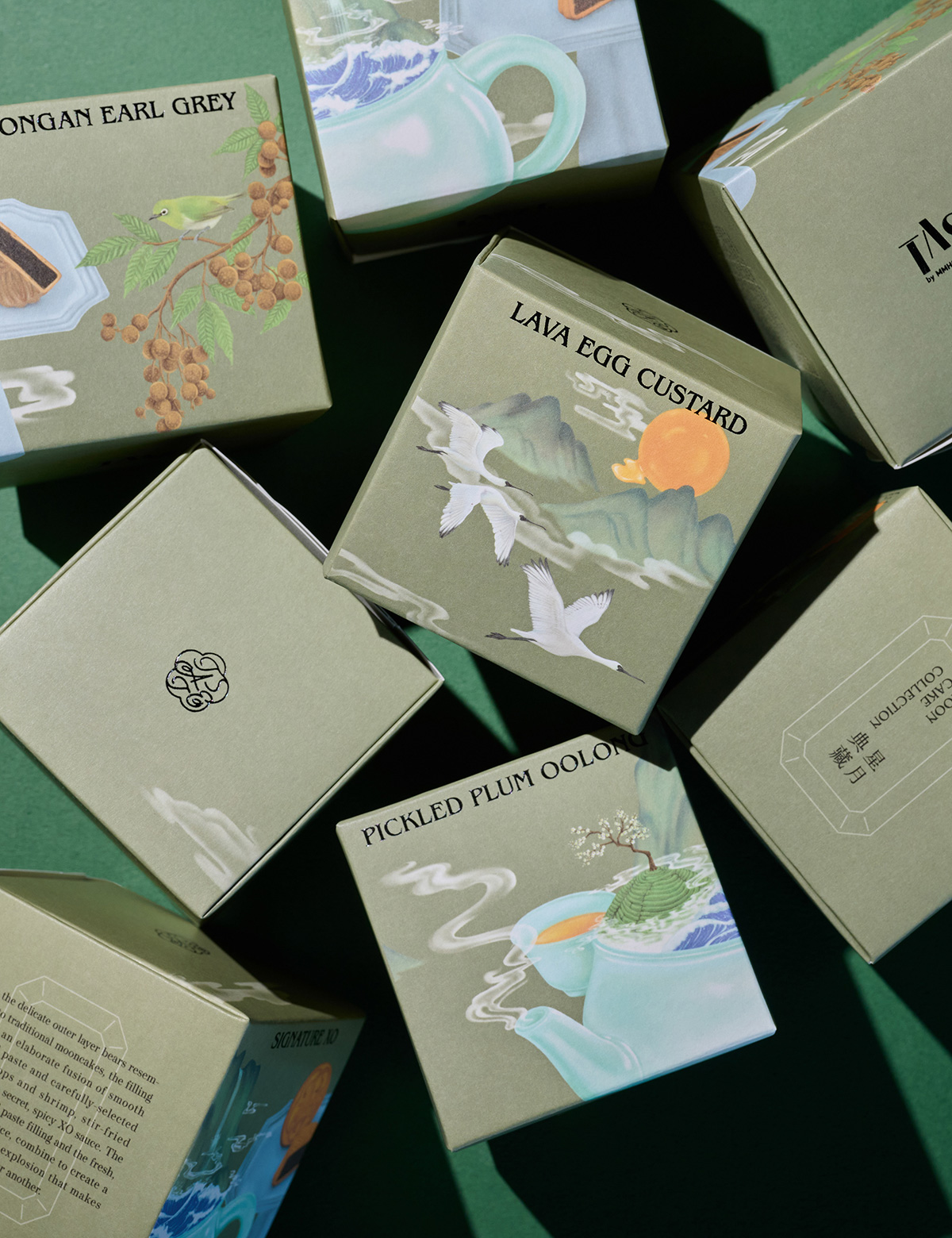 外盒以传统中式建筑的镂空窗花方式雕琢,打开映入眼帘的是四款根据食材特色元素的手绘18luck新利全站 ,有代表奶黄的圆月、茶香、海味、青梅与桂圆,拼装成一幅别具匠心的山水画,更以柔和、低对比的粉绿与粉肤色拼接作为主色调,整体更显气质典雅。