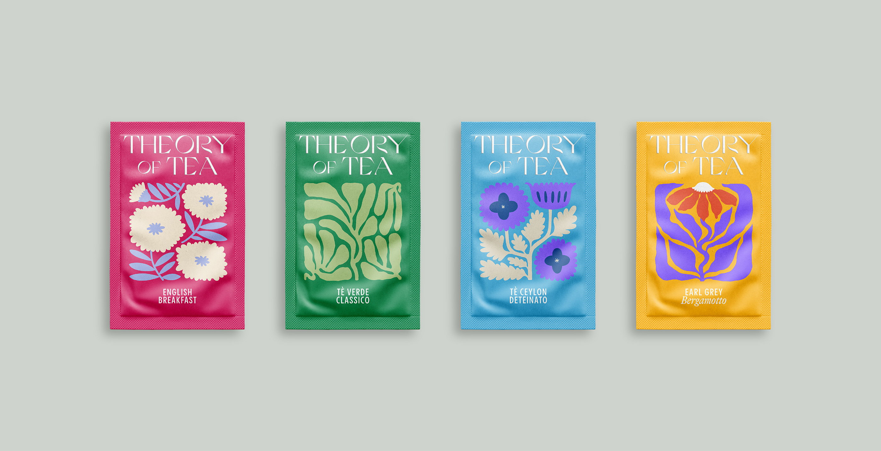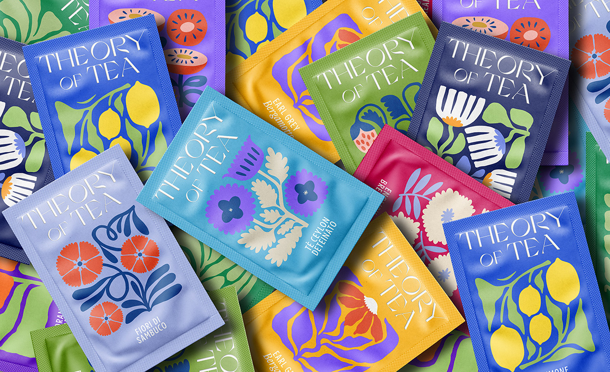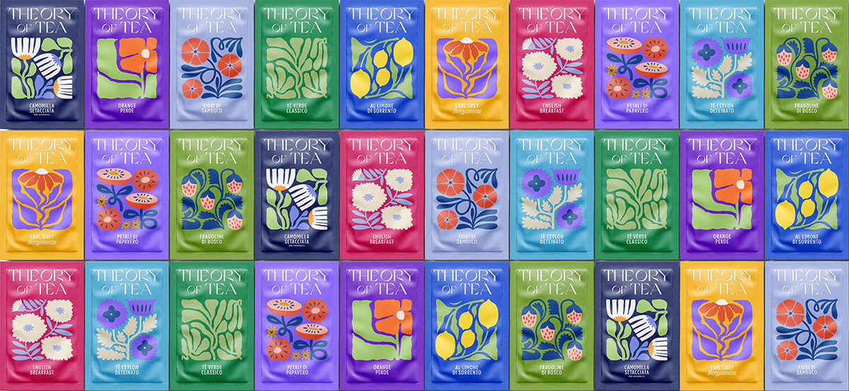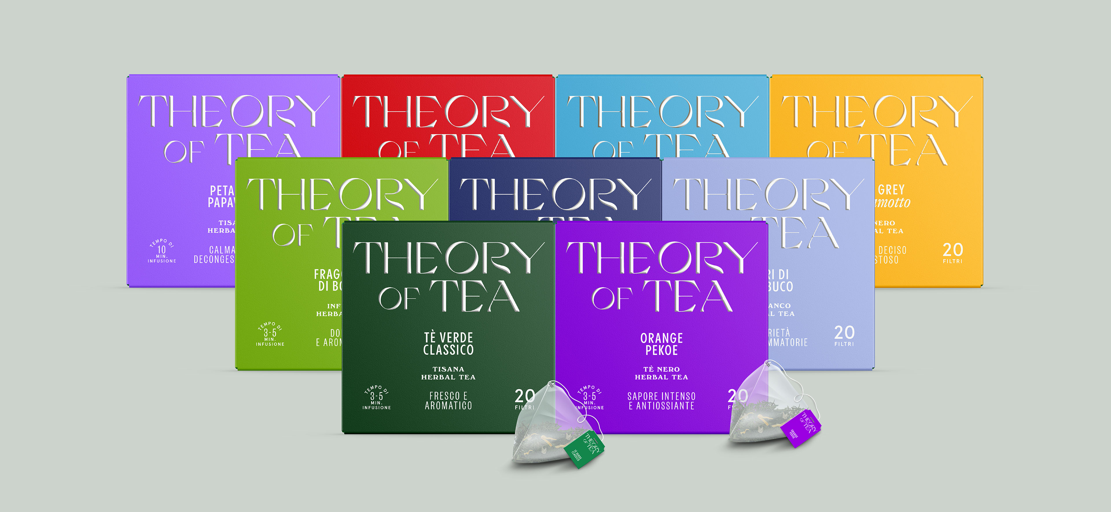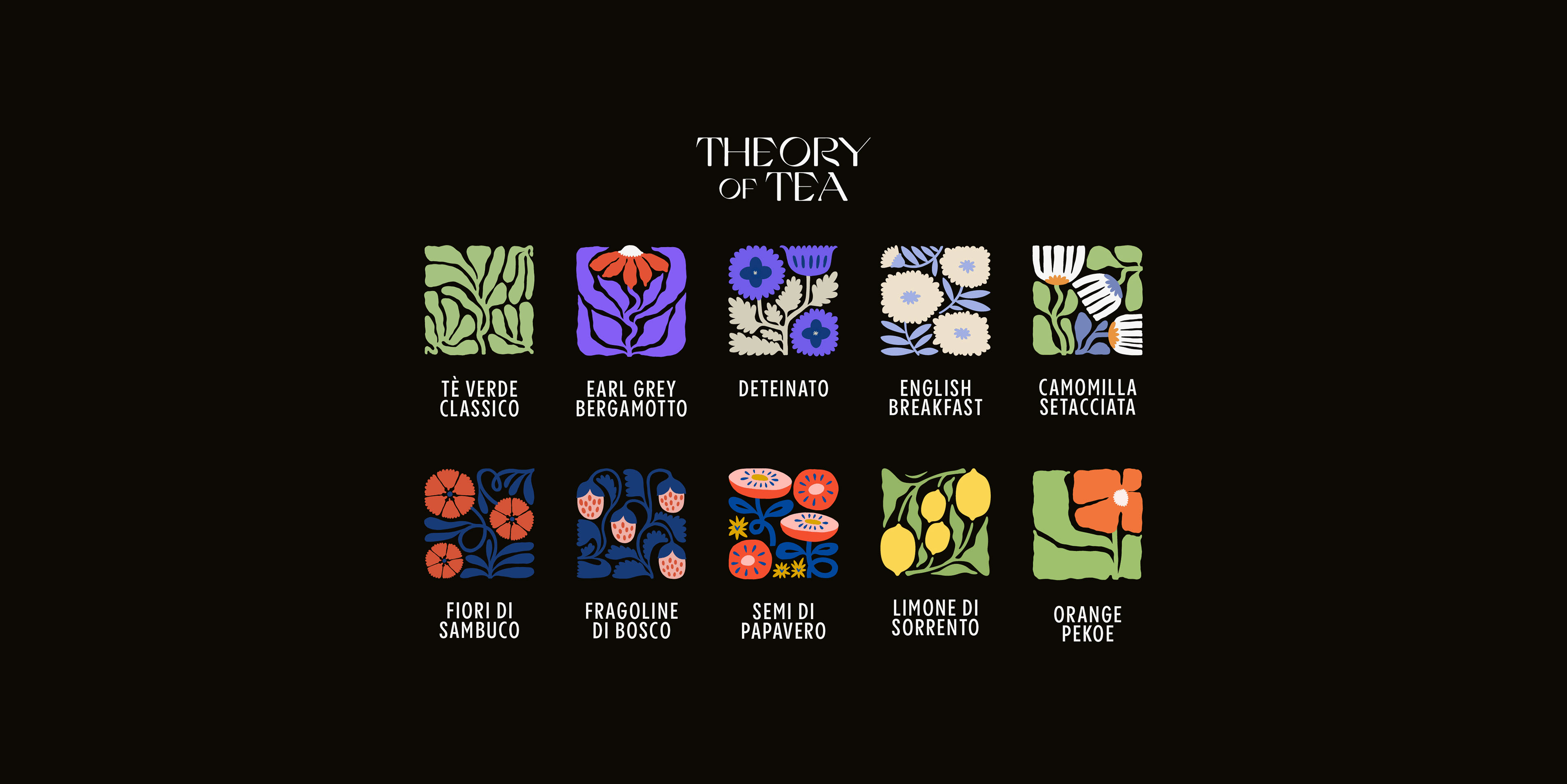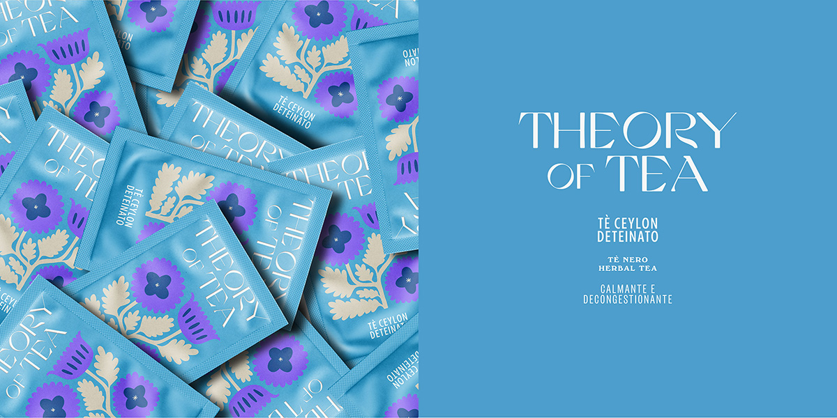 Theory of tea 是一个高端茶品牌,专为那些喜欢品茶的人打造。字体灵感来自茶山,蜿蜒、圆润、饱满、浓郁。茶叶包装在可持续和可回收的纸板盒中,装茶滤的袋子也是用纸制成的。插图是个性化的,每个花卉图案都是手绘的,以赋予每种混合茶更多的个性。