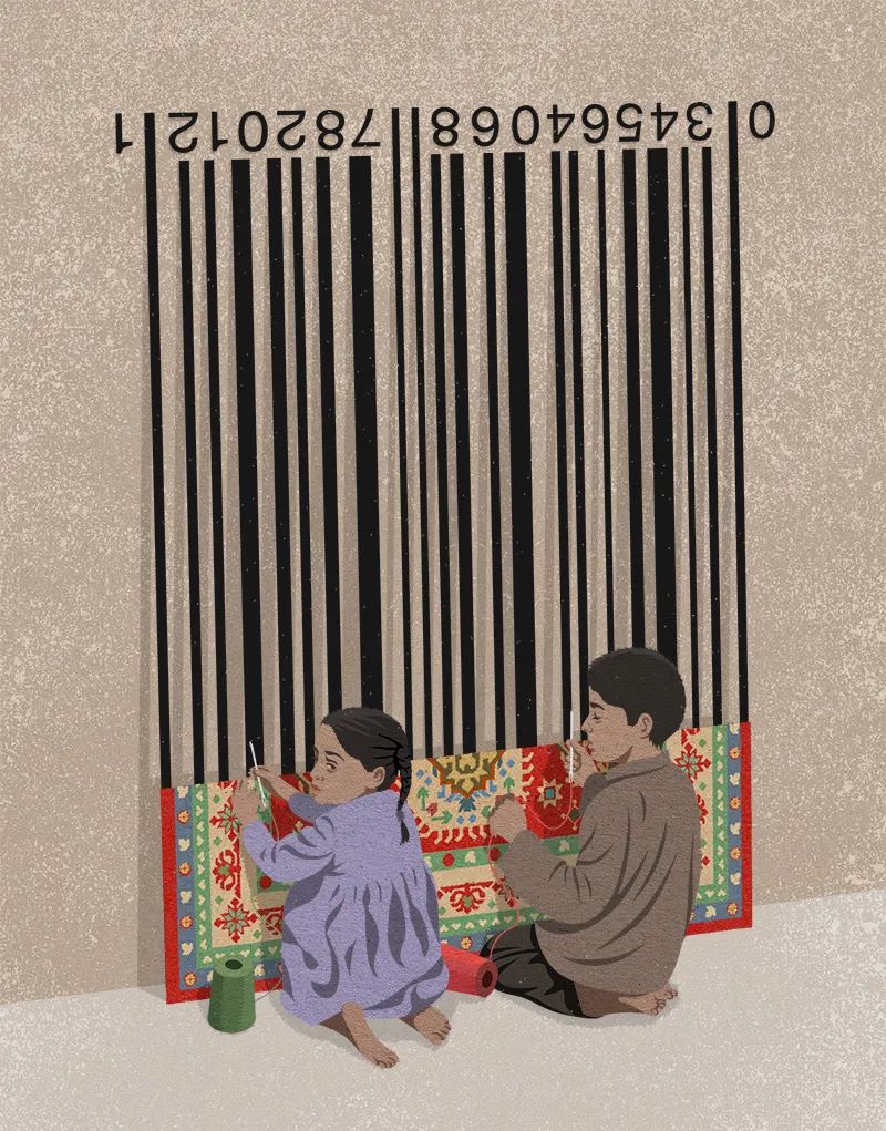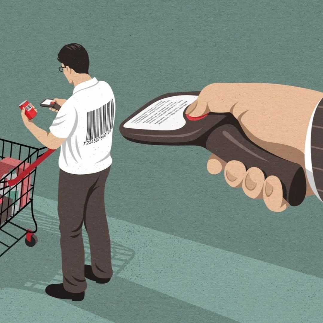 看到英国插画家John Holcroft笔下的这张插图时,下意识把图里的二维码扫描枪,看成了一把令人直冒冷汗的背后暗枪。但仔细一看,其实也不算完全会错意。