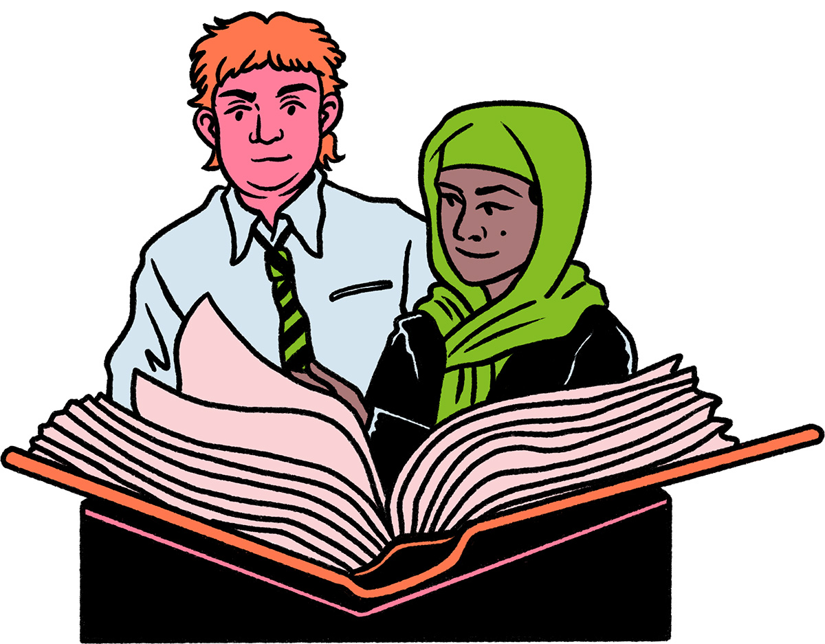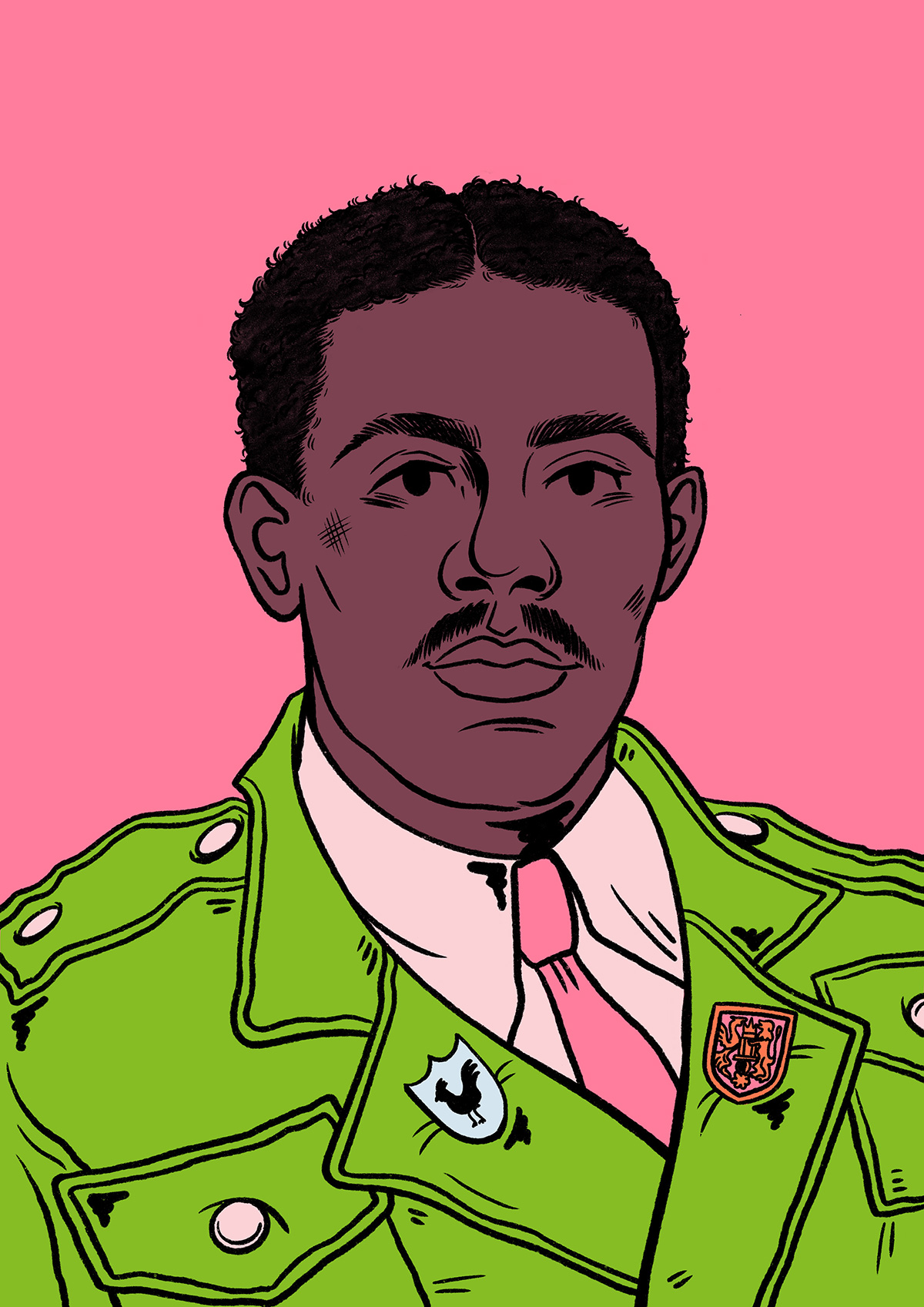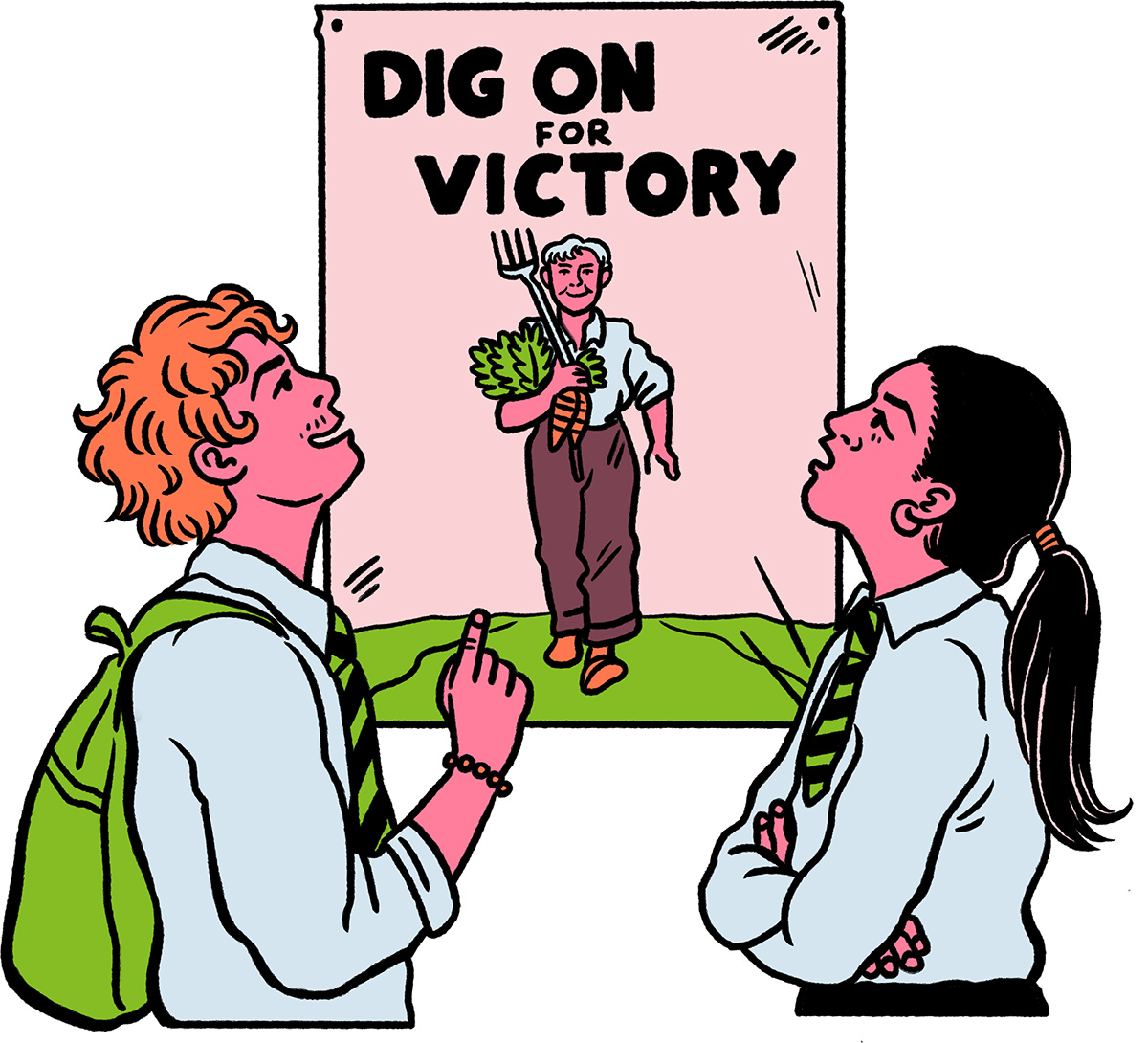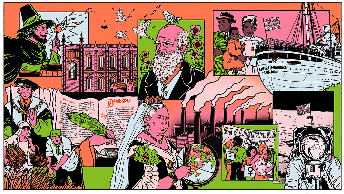 伦敦国家档案馆的一套插图,包括历史场景、历史人物肖像以及其网站教育资源部分的提示图标。