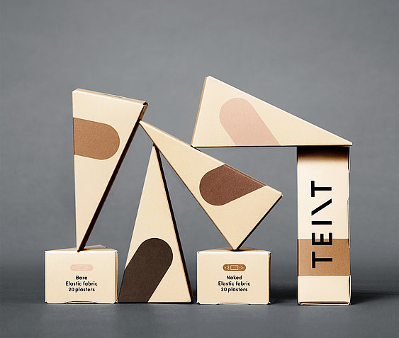 Teint 提供了多种肤色可供用户选择,三角形形状打破了纯粹医疗产品包装外观的常见印象。这种包装还具有功能优势,因为与传统的药盒不同,它可以允许用户用一只手去操作使用。