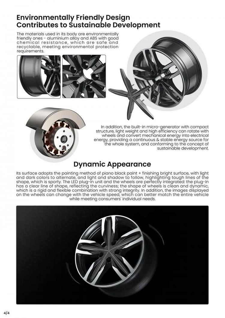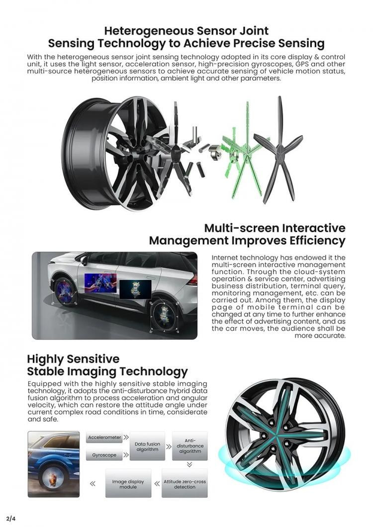 这是一款以轮子为载体,无屏显示裸眼3D图像的智能显示系统。可应用于广告数据投放、危险预警、智能车况监测等场景。还可根据驾驶者的心情设置任意图像进行人车交互,满足消费者对个性化、智能轮毂产品的需求。
