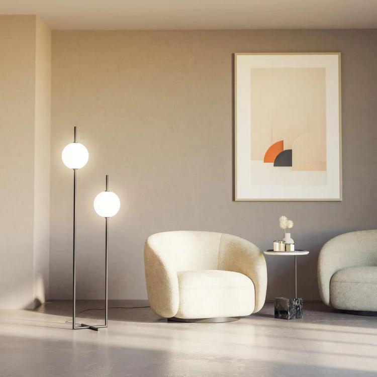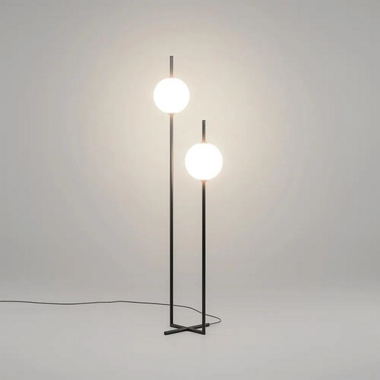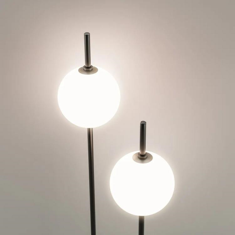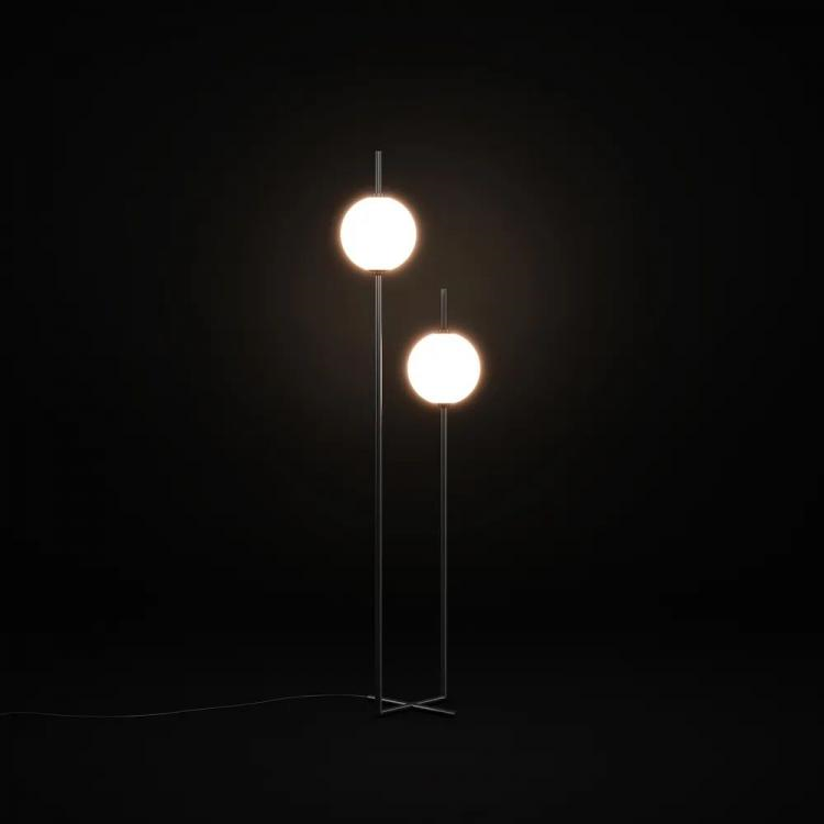 这款落地灯的两个光源的开关位于人的手的水平位置,这使得可以调节站着、坐着或躺在软垫家具上的光源数量。