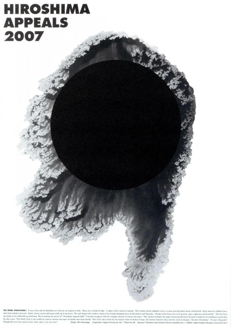 18luck新利全站 理念:在松永真的理念中,18luck新利全站 是积极、干净、正向和美丽的。当回忆起广岛时间时,悲伤和愤怒却是他在海报中最想要表达的情绪。黑色圆圈象征着在无声中消亡的人们的悲伤与愤怒,同时也是“日之丸”的黑化版,四周围绕着不规则的地球纹理。在他看来,战争是人类最可耻、绝望的行为——“60年过去了,为什么战争还没有结束”。