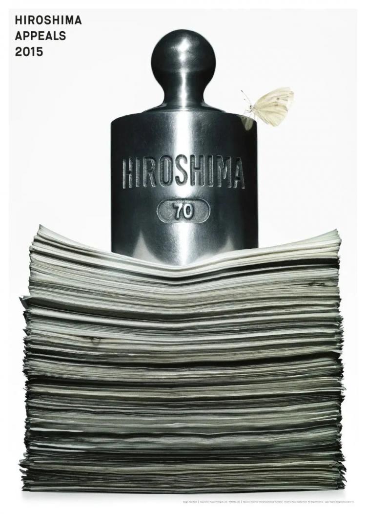 18luck新利全站 理念:海报中用一摞被沉重砝码压住的文件来象征抵制战争。文件代表着不同声音与观点,印着“广岛”的砝码则重重的压制在上面,佐藤卓想表达的是:“有些事情,无论提出什么样的理由,都是绝对不能做的。”砝码上还停留了一只蝴蝶,以致敬由龟仓雄策创作的“广岛呼吁”系列首幅海报——《燃烧的蝴蝶》。