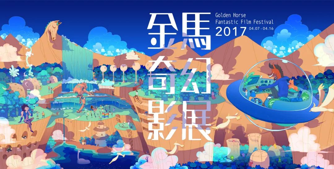 2017年主视觉也是来自苏文圣。在这张被影迷们称作“奇幻版的清明上河图”里,外星马乘着飞碟来到了地球,一眼望去是人间的世外桃源——一个以《洛基恐怖秀》为背景,人与自然、动物、科技和谐共处的多元场景。