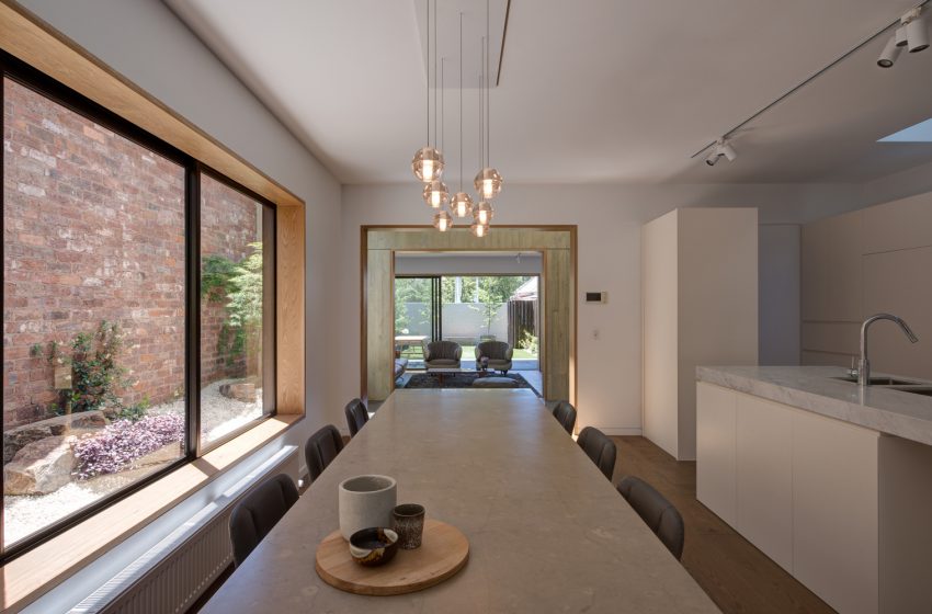 在这座房子上工作的建筑师团队试图与自然元素进行更深入的接触,并偏离了以前后花园为特色的常规布局。取而代之的是,他们将花园整合到了朝向北方的空间中,位于房产的前部。
