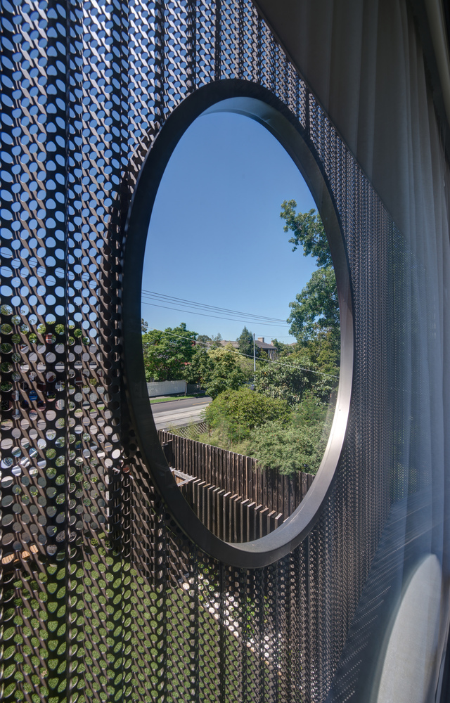 这座房子最漂亮的地方之一就是紧绷的纤维水泥板雨幕。它还扮演着一个隐私角色,因为它遮住了他们身后的大部分窗户。