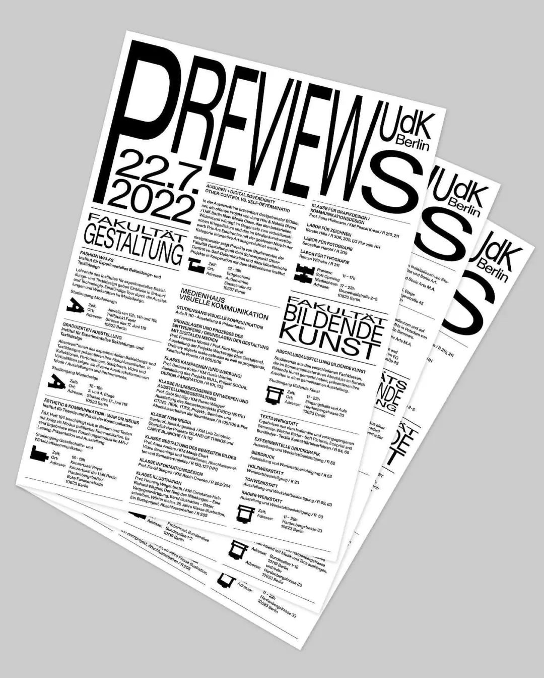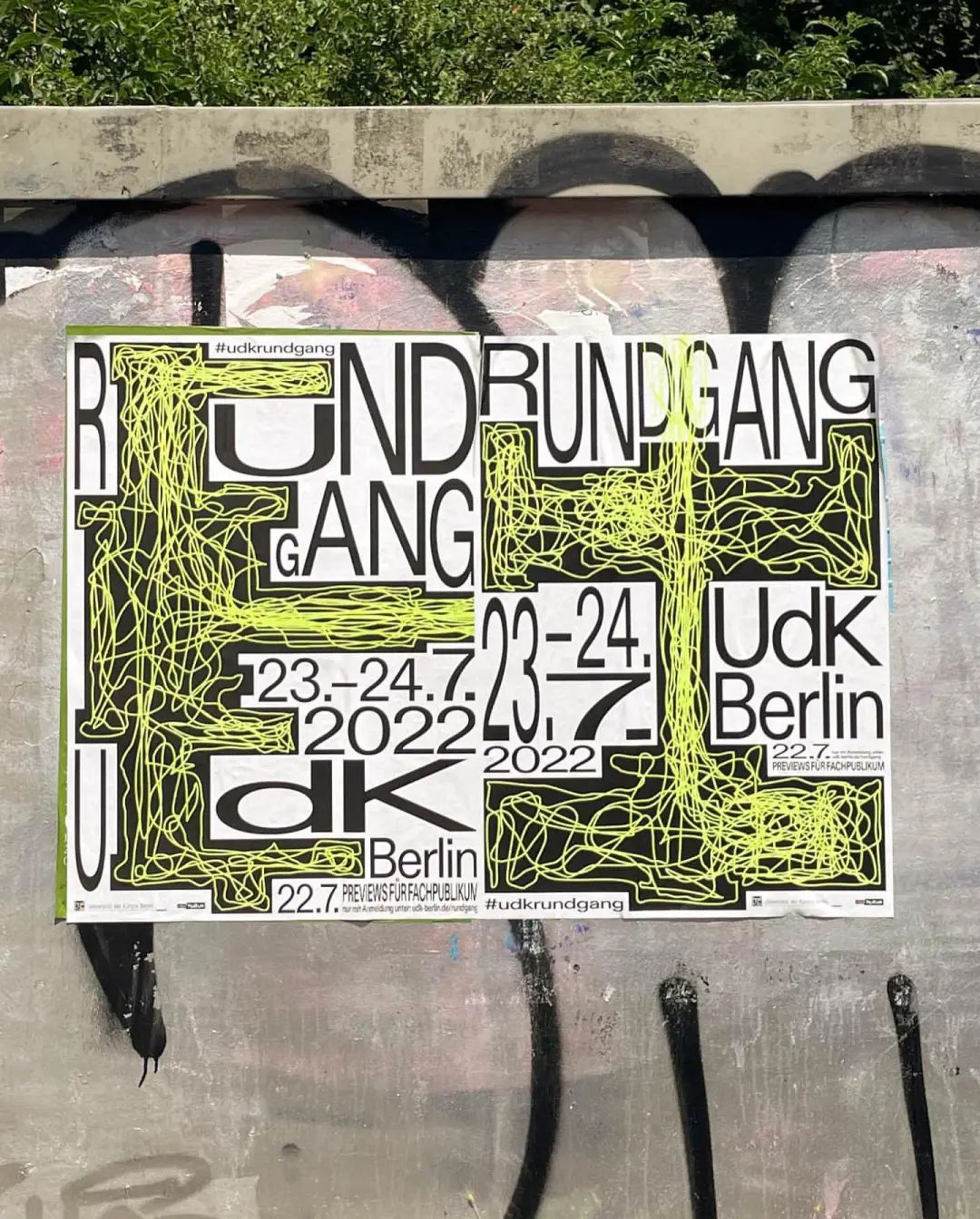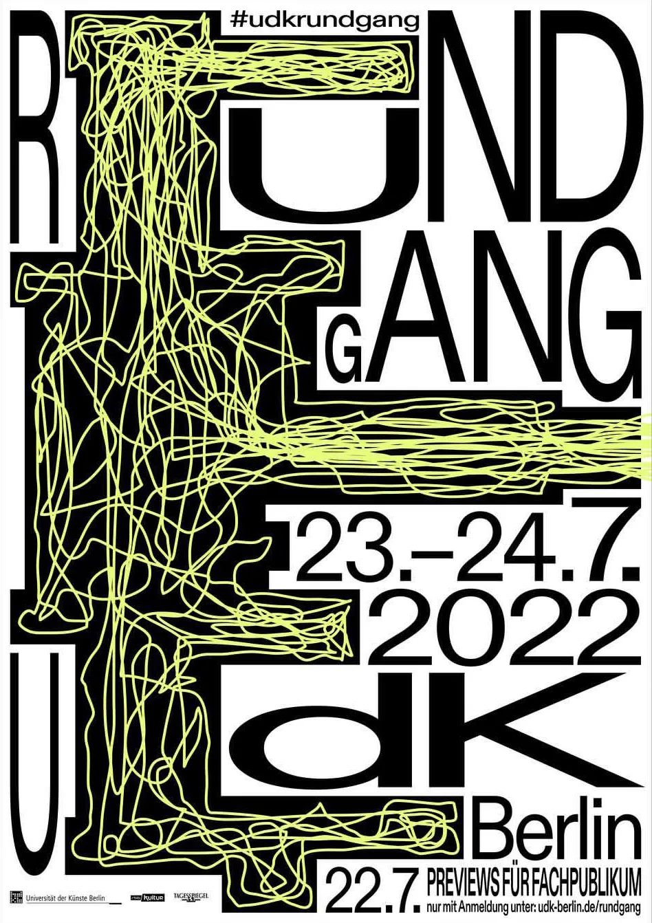 柏林艺术大学的开放日(Rundgang)是柏林文化之夏中一个牢固确立的活动。在学年结束时,德国最大的艺术大学及其四个学院、柏林职业学院和大学间舞蹈中心向公众开放其车间、工作室和排练室,从而创造了一个与我们的艺术家和他们的作品接触的机会。