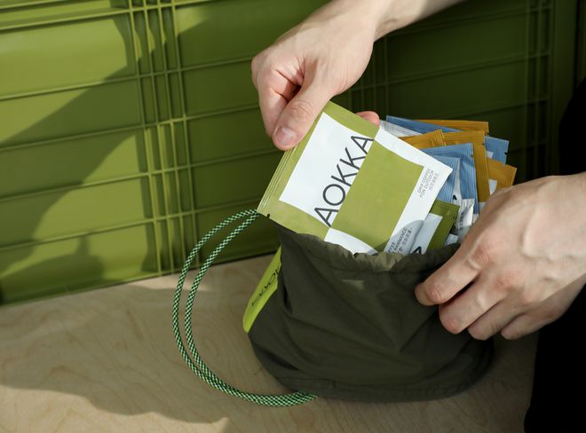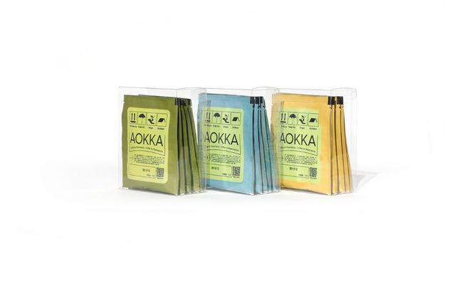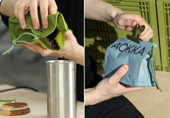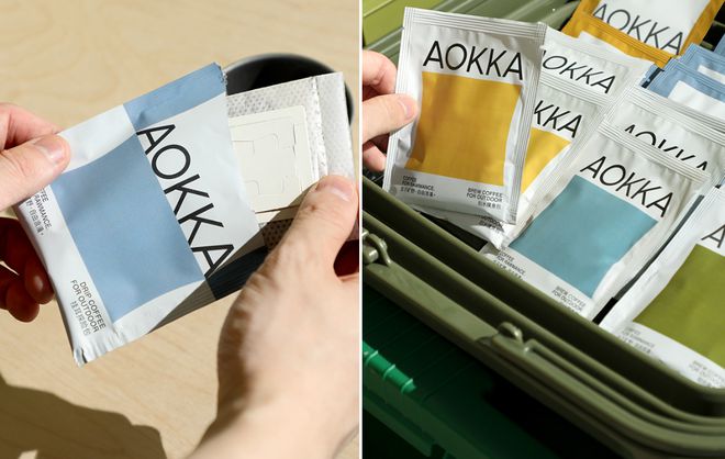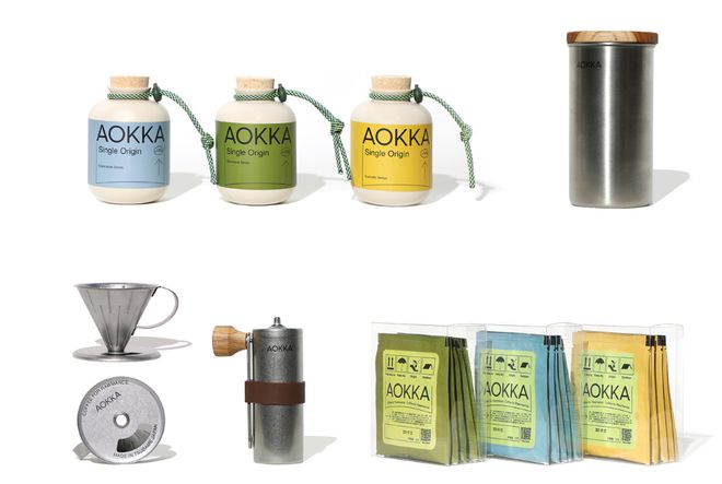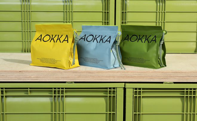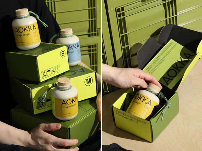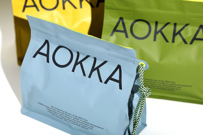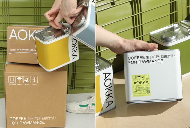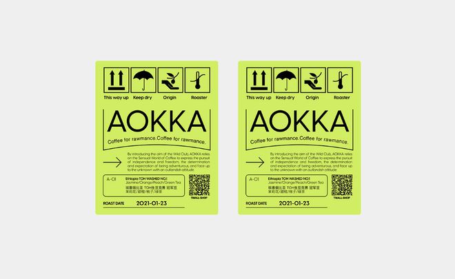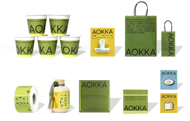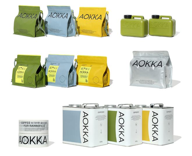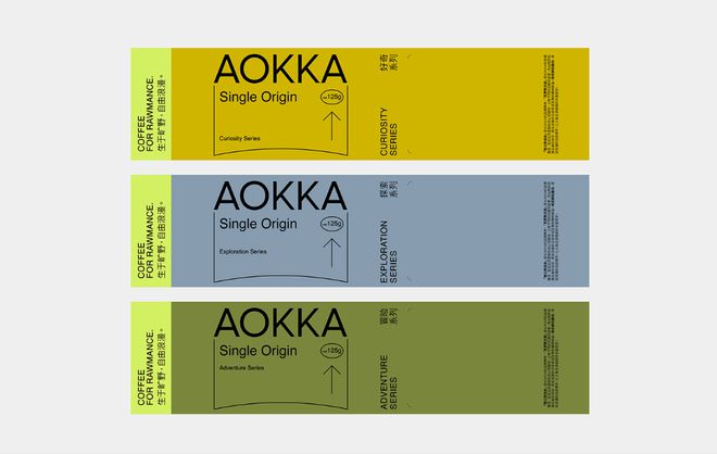 绿色是属于荒野的颜色,荧光黄的色彩灵感来源于户外产品和运输安全的标识.黄色、蓝色为AOKKA的品牌辅助色,并且AOKKA的色彩体系也用于区分产品线.将咖啡豆产品线分为好奇系列(黄色)、探索系列(蓝色)和冒险系列(绿色).