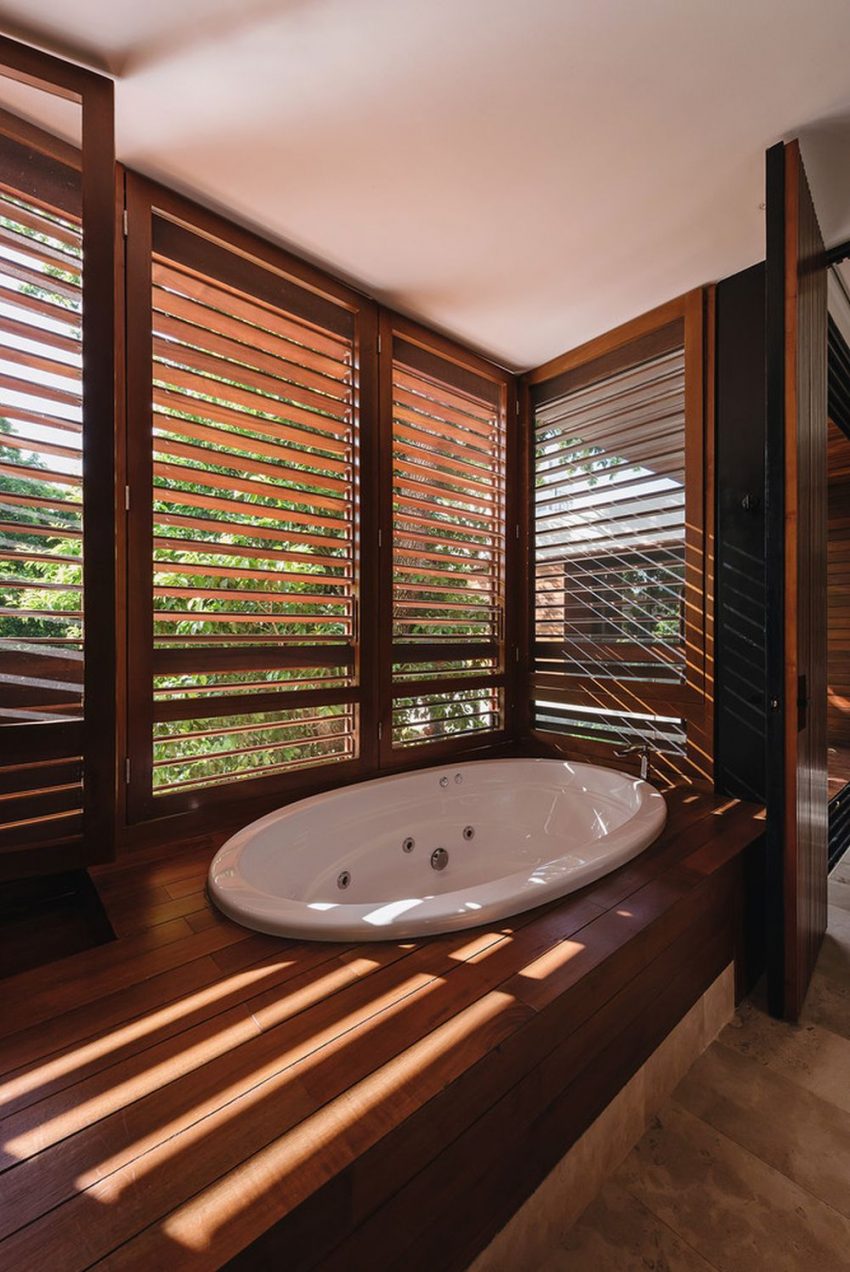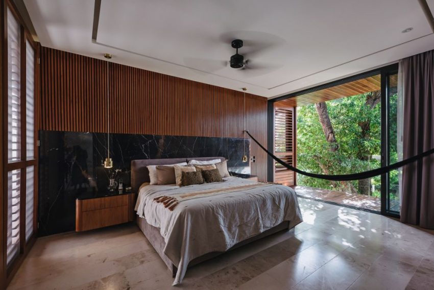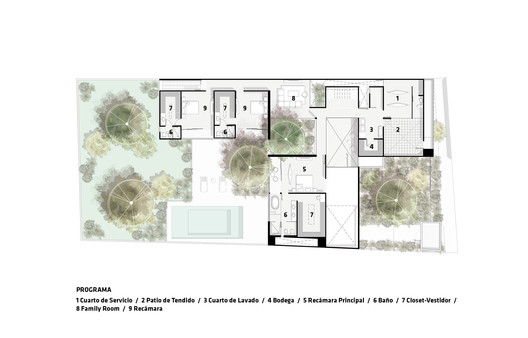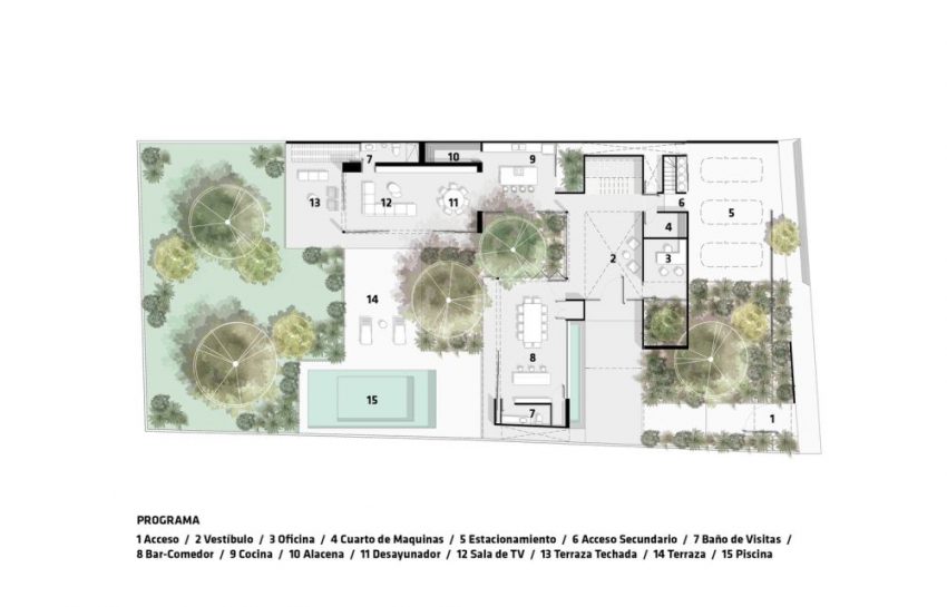 房子围绕着内花园“旋转”,在那里你会发现许多树木和绿色植物,一个休息区和一个游泳池。