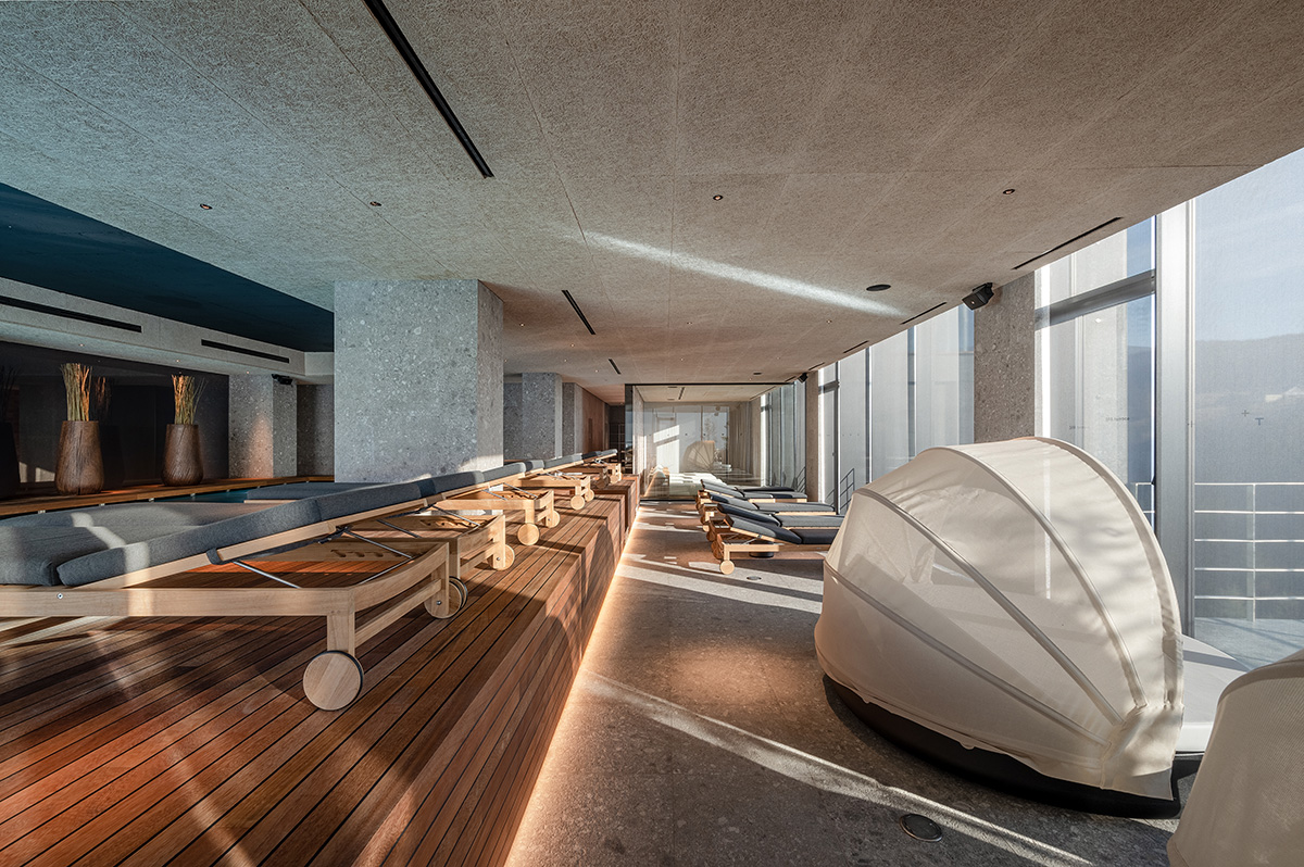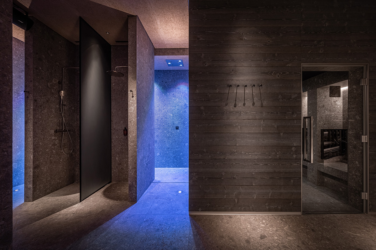 泳池旁的植物酒吧提供当地草药系列。水疗护理领域延续了草药的主题。其中之一是 Kraxen 桑拿房,蒸汽穿过干草,使其充满天然香气。四间按摩室使用的化妆品、材料和酊剂也均以当地草药为原料。芬兰桑拿浴室设有全景窗户并享有森林景观,是冥想和沉思周围美景的场所。