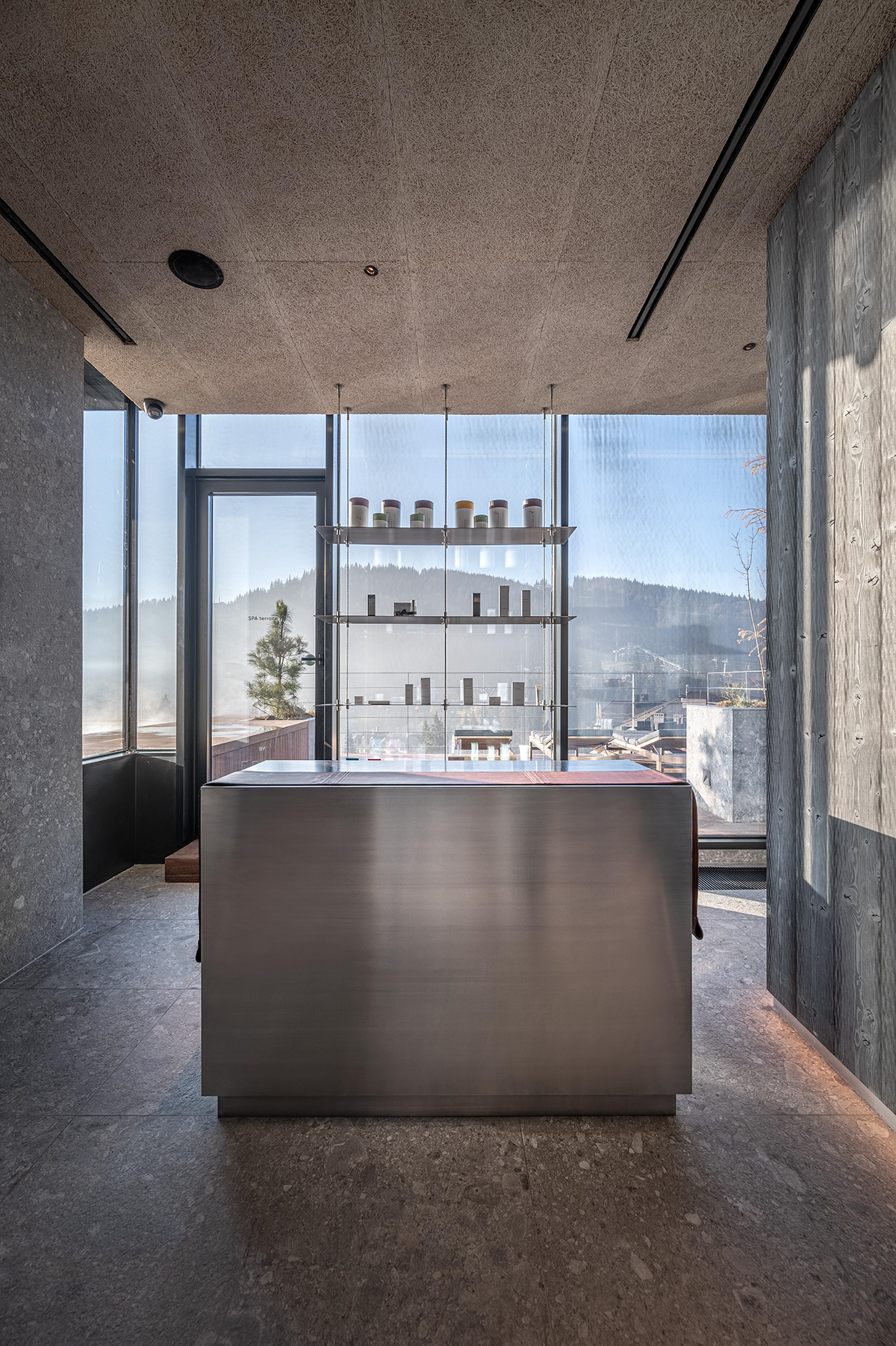 一个独特的解决方案是在底部设有出口和舷窗的钢制水池。泳道一部分在室内,另一部分在室外。水池位于距离地面约20米的高度。通过玻璃制成的端侧可以看到山坡和滑雪道。