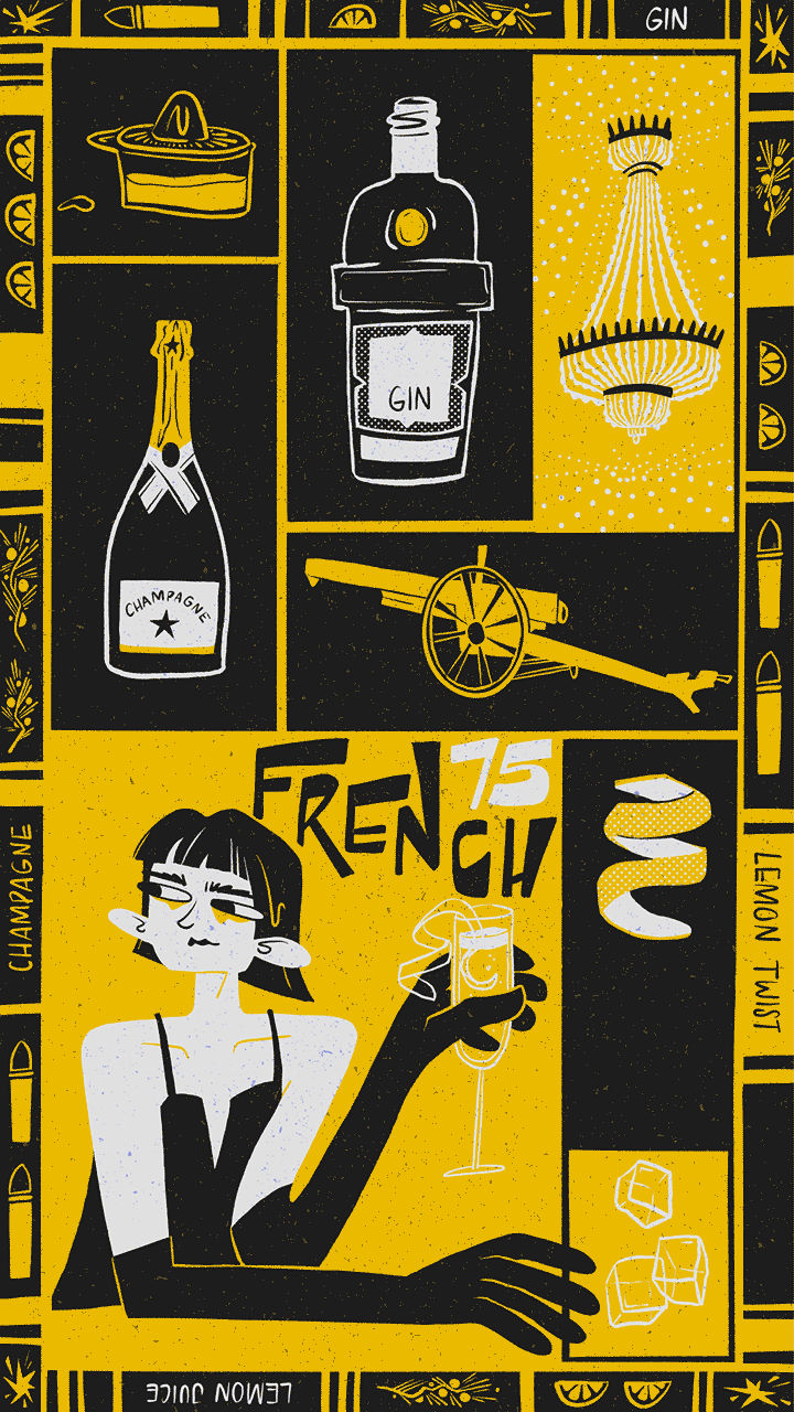 此个人项目让Léane得以进一步突破自己的风格,并将动态元素融入创作中。该系列作品探索了多款经典鸡尾酒:意式浓缩马天尼,能让人提神醒脑、活力焕发;法式 75(鸡尾酒),酒劲十足,据说其冲击力堪比 75 毫米口径炮弹;莫吉托的灵感则源自船上用于防治坏血病的药用混合饮品。